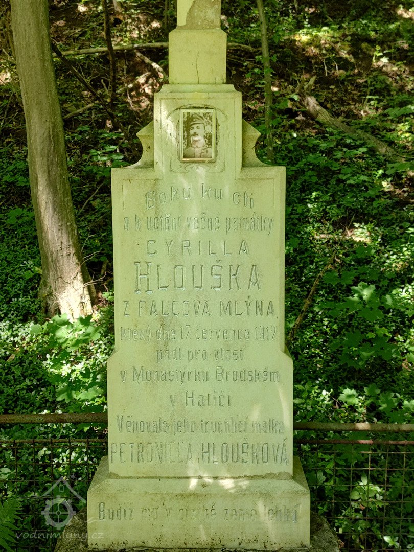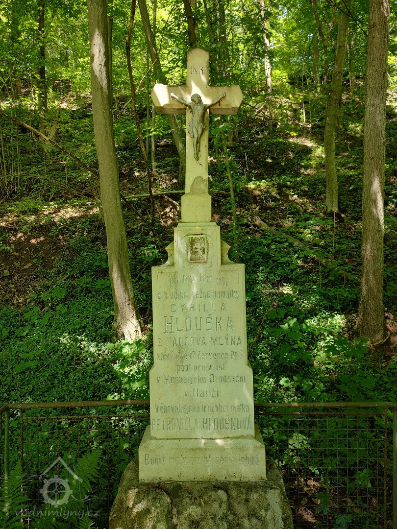 Nedaleko mlýna při cestě je pamětní křížek, s dojemným věnováním paňmámy mlynářky Petronilly Hlouškové synovi Cyrilovi, který padl v 1. světové válce.
