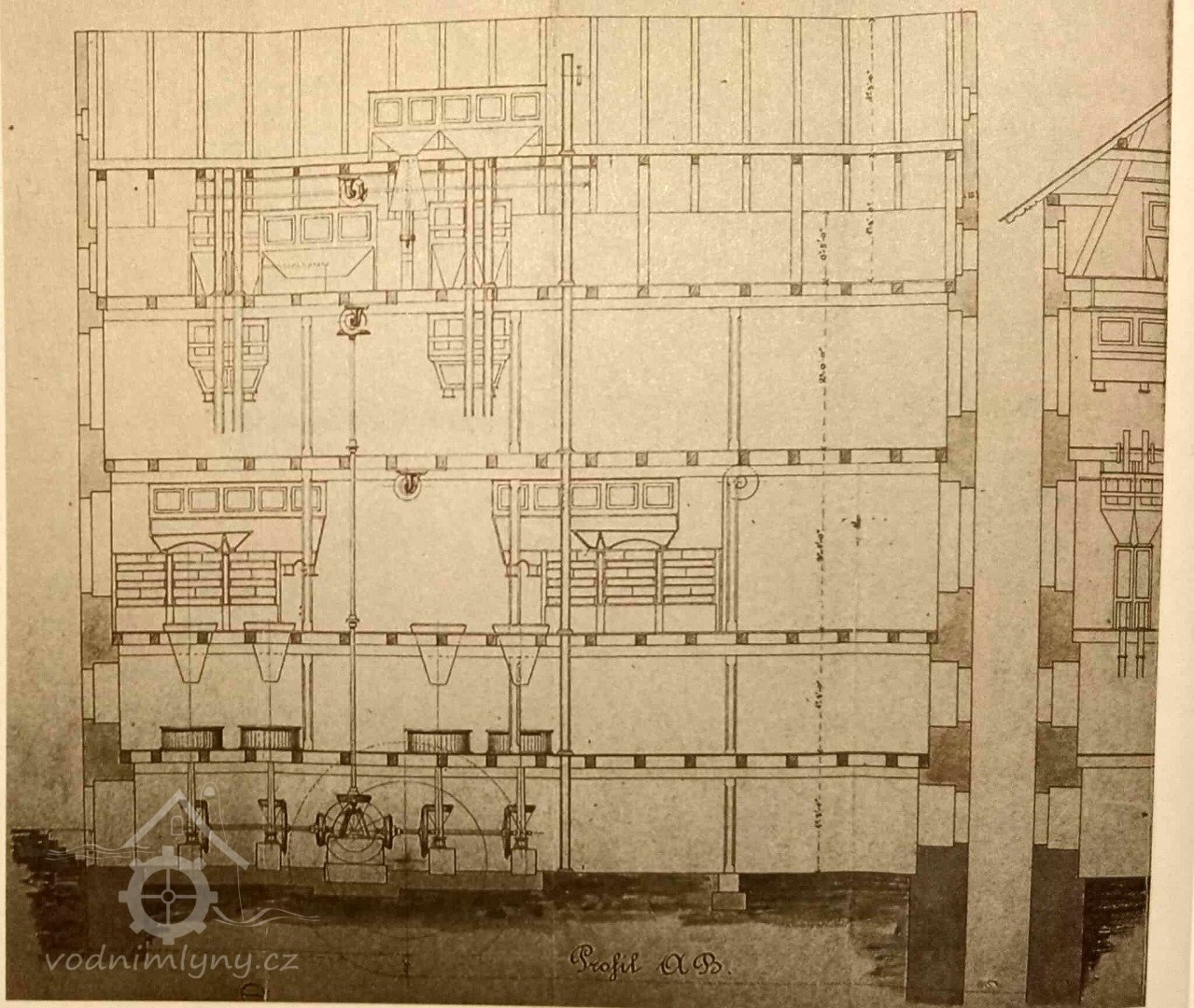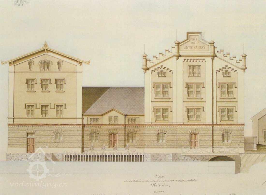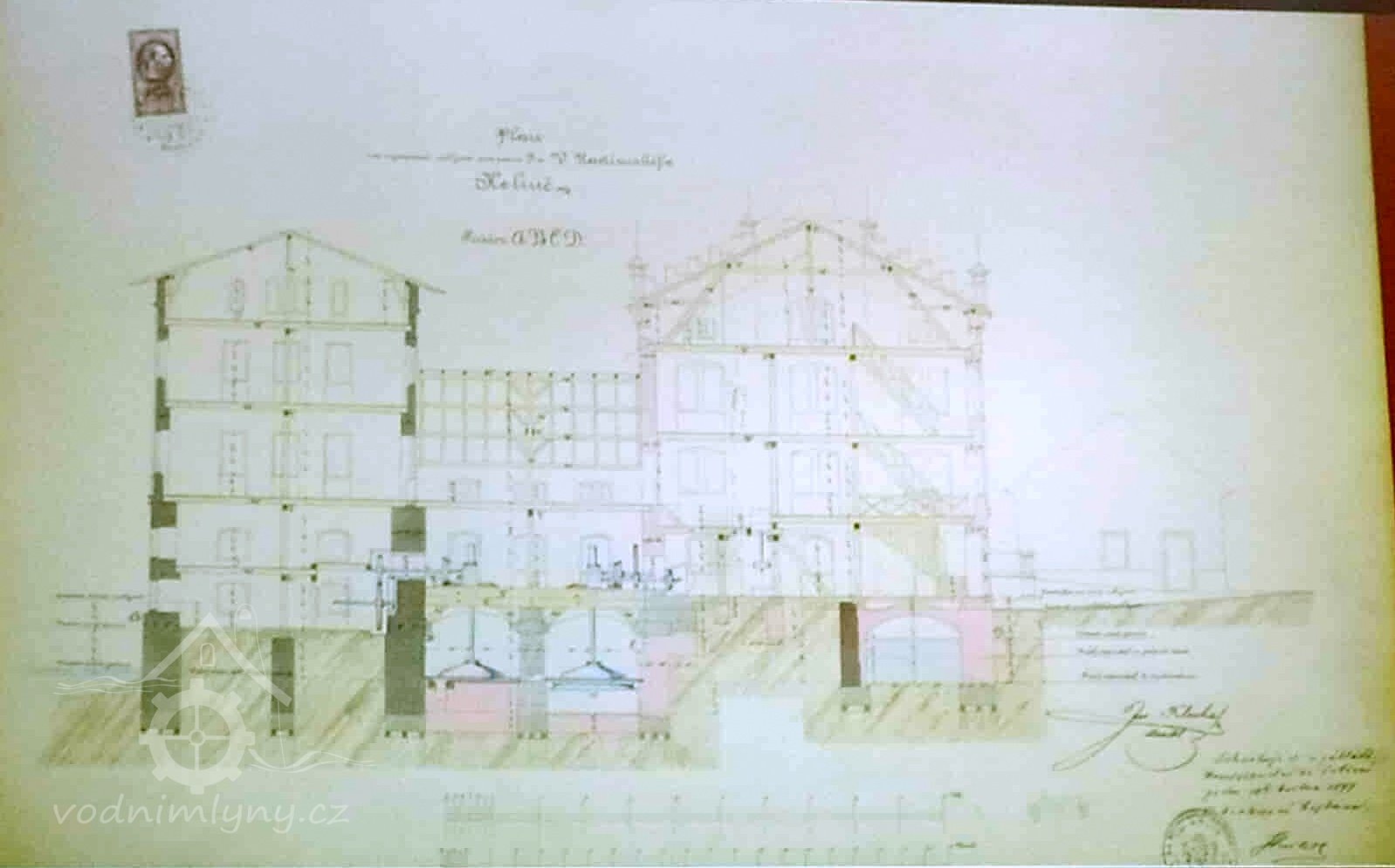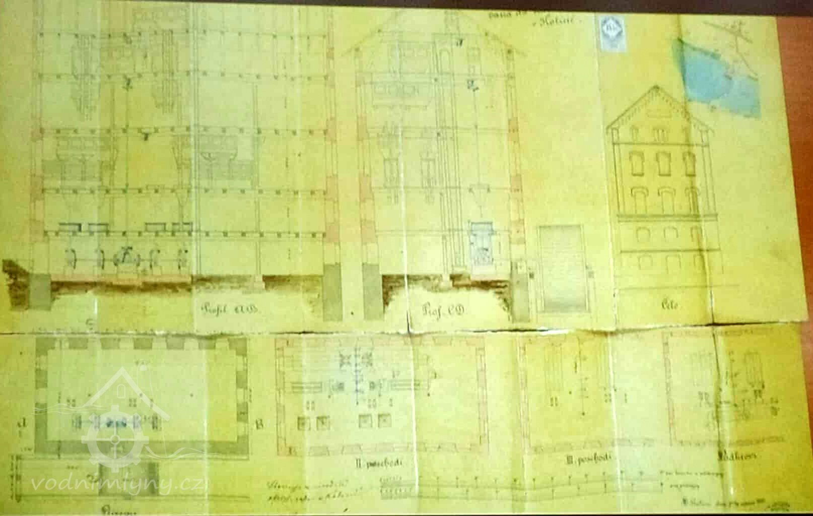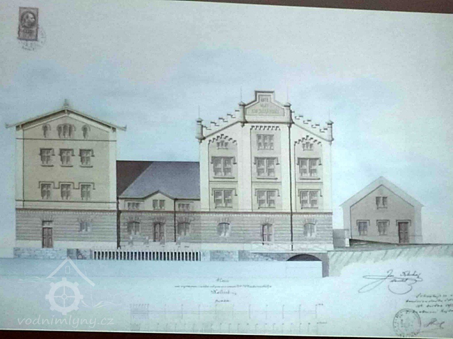 1877 - plány na nerealizovanou dostavbu mlýna od pražského stavitele Josefa Blechy