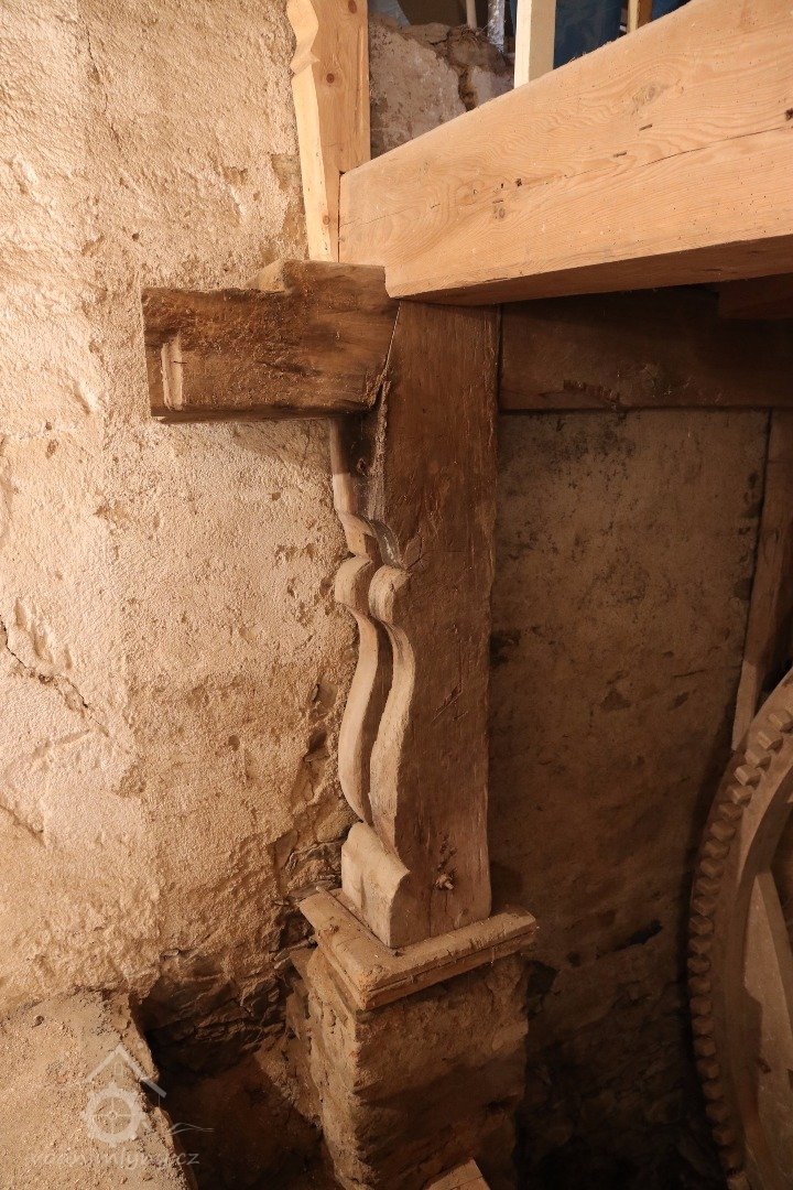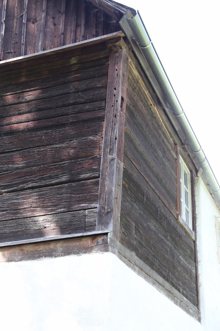 Jihovýchodní a jihozápadní stěna vrchního podlaží mlýnice je rovněž roubená do drážky, z druhotně použitého dřeva z let 1727-29. Nad celým domem je jediná podkrovní prostora polovalbové střechy, systému stojaté stolice, přesahuje nad zápražím. Spoje jsou čepované, jištěné dřevěnými kolíky - hřeby, veškeré dřevo j ručně opracované. Trámy krovu byly zhotoveny z jedlí kácených na přelomu let 1833/34.