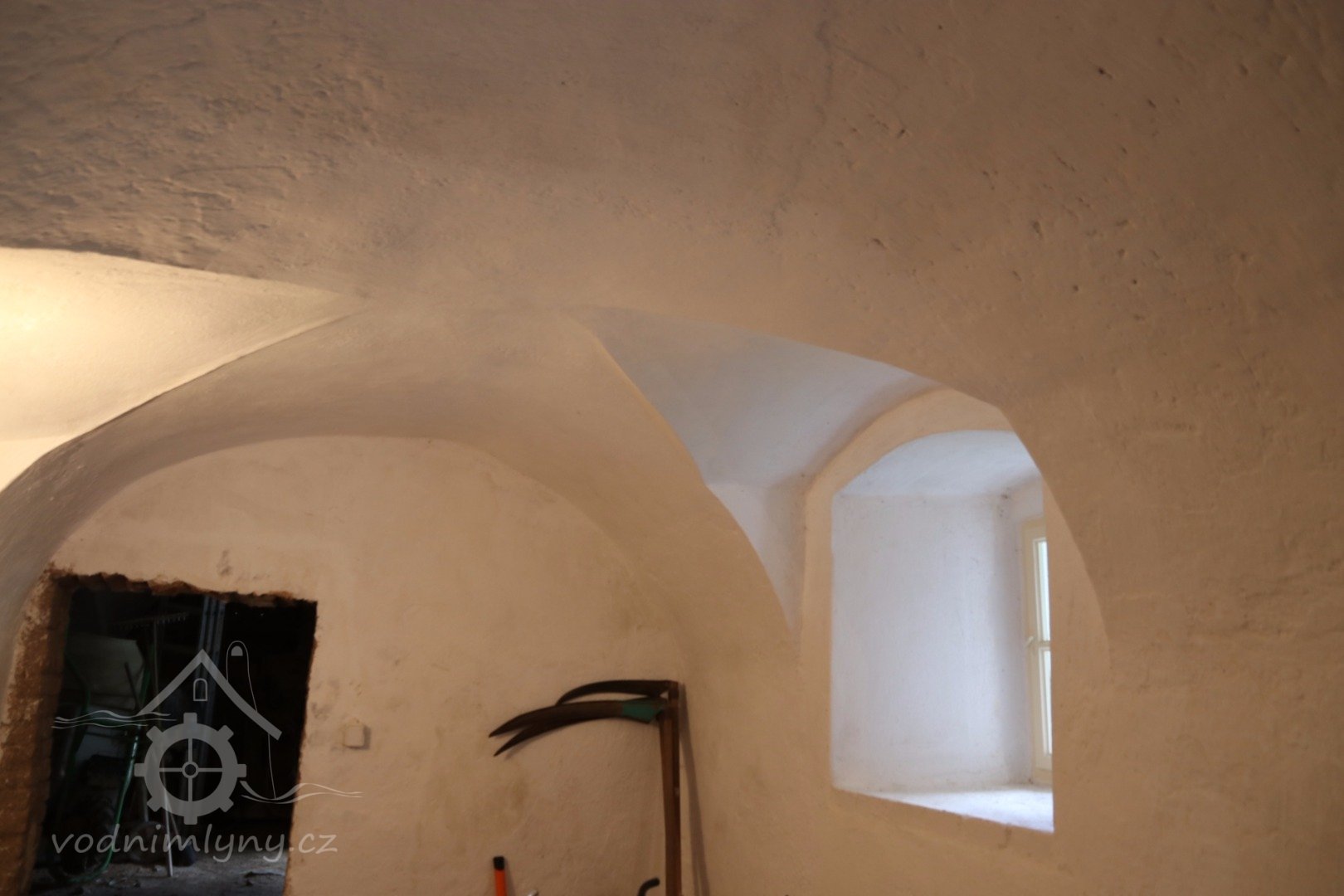 Komunikačním uzlem přízemí je plochostropá vstupní síň ve středním dílu, druhý jihovýchodní trakt středního dílu tvoří bývalá černá kuchyně. Kuchyně je zaklenutá dvěma nestejně širokými půlkruhovými pasy - úseky stoupající valené klenby, mezi nimiž je ponecháno široké ústí dobře dochovaného dymníku. V bočních stěnách černé kuchyně jsou široké niky - původně s obslužnými otvory topenišť. Ze síně do černé kuchyně vedou jednoduché svlakové dveře. Přední díl na severovýchodní straně tvoří jediná velká obytná světnice, která je plochostropá, s omítaným podhledem. Kamna jsou kachlová novodobá, po straně je zachována policová nika vzniklá úpravou krbečku. Protějškem světnice je rovněž plochostropá zadní světnice, přístupná ze síně rámovými dveřmi, od níž je roubenou příčkou oddělený ještě zadní díl přízemí mlýnice . Příčka byla dendrochronologicky datována do let 1727/28 a 1728/29 (druhotně použité dřevo), prahový a věncový trám pochází z let 1835/36.