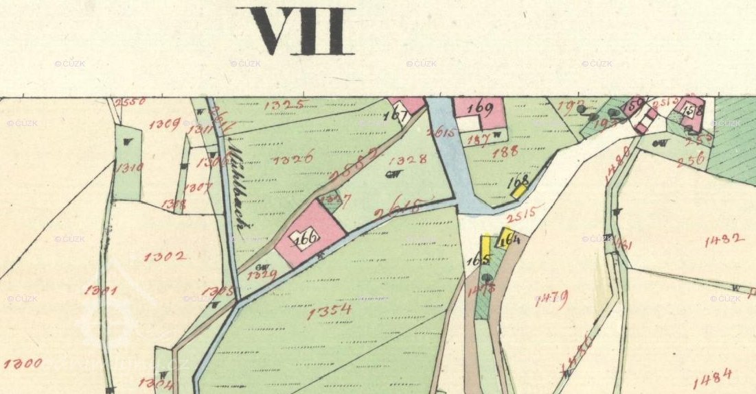 dnes náhon z potoka Loučky zasypán, zachován jen jalový odpad