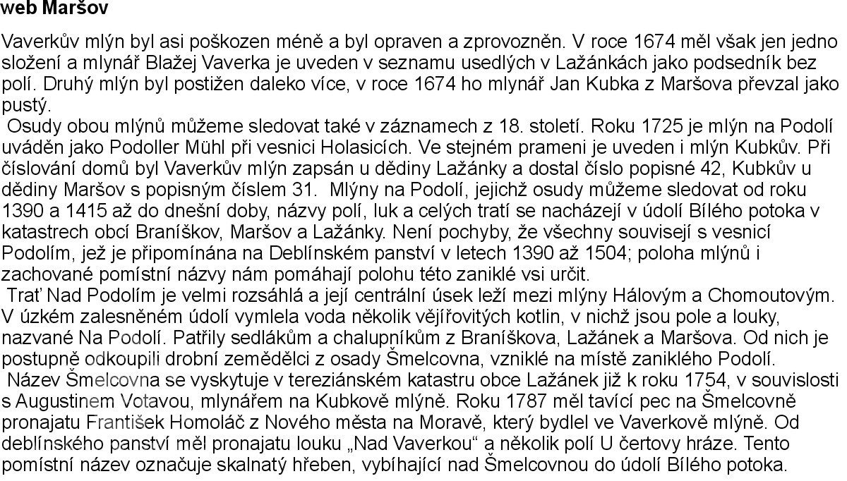 1674 - poškozený mlýn byl opraven a zprovzněn, měl jedno složení. Mlynář Blažej Vaverka, usedlý v Lažánkách jako podsedník.
