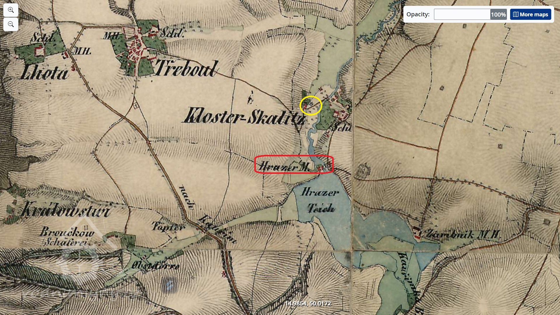 Roku 1677, folio 198n – 200n - urbář Kostelecký Popis bývalých obecních statků města Kouřimě, kdy byly již knížete Lichtenštejna Mlejn Hrázskej pod Kouřimí Ten někdy k městu Kouřimu a důchodům obecním přináležel. Nebo v starých pamětech vynachází, že jest od pánův Kouřimských v létu 1489 vystavený byl. A leží pod rybníkem Hrázský (dříve zvaný Veliký) naproti polední straně a k půlnoci, od země kde strojové nebo mlejnské složení jest, vše od zdi z kamení vyzdvižený tímto způsobem: Předně přijdouce ze dvora od strany západní ke mlejnským veřejům dřevěným jsou dveře na klapačkách, a projdouce skrze ně po čtyrech stupních dřevěných níže od země a do mlejna, nacházejí se mlejny nebo složení pro mletí mouky s kolmi vodními, palečními a všemi potřebami příslušejícími po straně vejchodní dvoje. I ten předce v tý straně kolo vodní a proti němu ve mlejně jahelka se všemi potřebami. Zase čtvrté kolo vodní s hřídelem, pupky, které táhne 5 stup a pod nimi jest štok ze dřeva spůsobený. V tom mlejně je oken 5 bez skel, na západ 2, na vejchod 3, a dvířka s klapačkou nad lednicí okolo strojů mlejnských, podobně stup podlaha z prken falcovních, aby se obilí rozsejpati nemohlo, uděláno jest. Item okolo vodních kol zděná lednice, a místem, kde potřeba ukazuje, prkny opažena, aby voda od kol stříkající se zdí vápno nevyplachovala. Opět z toho mlejna dřevěný veřeje s dveřmi na pantech do komory zděný klenutí jsouce hrubě rozpukány, sloupy a kříži podtaženy, což mlynář pro dobytek hovězí potřebuje. A za tím ještě jedna komora zděná, pod světnicí prázdná; do těch komor okna 2 bez skel. Z toho mlejna nahoru na líhách tesány schody do hořejšího stavení a podlahu nade mlejny na falc složenou pro sejpání obilí. Druhé stavení hořejší následuje : sejdouce s hráze rybníka, slove Hrázského, přijde se na pavlač (podle vantroků) toliko vyštocholcovanou po straně vejchodní, a z té pavlače veřeje dřevěný s dveřmi na pantích do síně na západ. Z té síně dveře na pantích do světnice, roubeny na poledne, v ní okna na vejchod zabedněny, jedno na poledne se skly 2 a na západě též se sklem 1. Kamna prostý na zděným. Topení ze síně s pláštěm mazaným a komínem štycholcovaným. Pec pro pečení chleba pod zákamní do světnice jedna. Zase z té síně veřeje na podlahu na falc složenou nad stroje mlejnské, což se za síň nebo sejpku pokládá. Na ní okna na vejchod bez skel 2, na západ 2 a schody na líhách tesány na svrchní podlahu dílem mazanou a ostatek z prken kladenou. Opět z té síně komory 2 k půlnoční straně s dveřmi na pantech, v nich podlahy nad stroji mlejnskými na falc složeny. To všechno stavení hořejší (mimo světnici roubenou) na vazbu a lepenici postaveny jest. Nad tím celým štokem krov náležitý postavený, šindelem pobitý jest, na poledne štít prkenný, v něm dvířka na pantích a na západ svisle jsou. Opět zpředu jmenované síně a hořejšího stavení, jest pavlač s podlahou po obou stranách na štycholce mazaná, krůvkem přikrytá a šindelem pobitá, přes dvůr do druhého štoku z kamene vystaveného, v němž se nacházejí při zemi zděná maštal pro 6 koní nebo dobytka hovězího. Proti té pavlači komora prostřední zděná s dveřmi na pantích, a z ní do hořejší (v třetím vejšky stavení) komory schody na líhách tesány. Ten štok krovem přikrytý krakolci pro bezpečnost zdí od trámů stažený a šindelem pobitý jest. Při tom dotčeném štoku při zemi podle maštale jsou dva chlévy roubeny, nebo krmníky sviňsky, jeden na západ a druhý na půl noci, s dveřmi trojími na klapačkách, toliko námětky přikrytý a došky pošitý. Zase naproti tomu mlejnu a štoku zděnému jest při hrázi stodůlka o jednom zádění s mlátkem, kdež někdy nějaké chlívky bejvaly, přikrytá krovem a došky pošitá. Item proti strojům mlejnským na dvorečku klenutý podzemní sklep bez přikrytí, sdveřmi na klapačkách. Skála tvrdá křemenitá po straně proti splavu a vantrokám mlejnským. Z toho mlejna platí mlynář nájmu ročně : Vepře 4 nebo za každého po 8 zl. 10 kr. rýnských. Žita 50 korců, nebo za každý korec odvésti peníze vedle trhu v kraji jdoucího a potřeby vrchnosti. Otrubů žitných 25 korců. Od p. Havla r. 1677 zvejšen o 2 vepře a 14 kop míšeňských. K nájmu se mlynářovi přidává ode dvora Zárybnického rolí k osívání 2 kopě záhonů. Item palouček nad rybníkem Hrázským a cestou, jdouce do Kouřima po pravý ruce na poledne, na němž nakliditi může sena 1 vůz. Item jdouce k pustému dvoru Zárybnickému štěpnice s 15 štěpy, dílem višňovým, kouskem štěpnice, rolí pro předivo a ostatek s pláněmi. Palouk a zahrada odňata ke dvoru Zárybnickému. K tomu mlejnu přináležejí s melivem ves Lipany a Dobré pole.