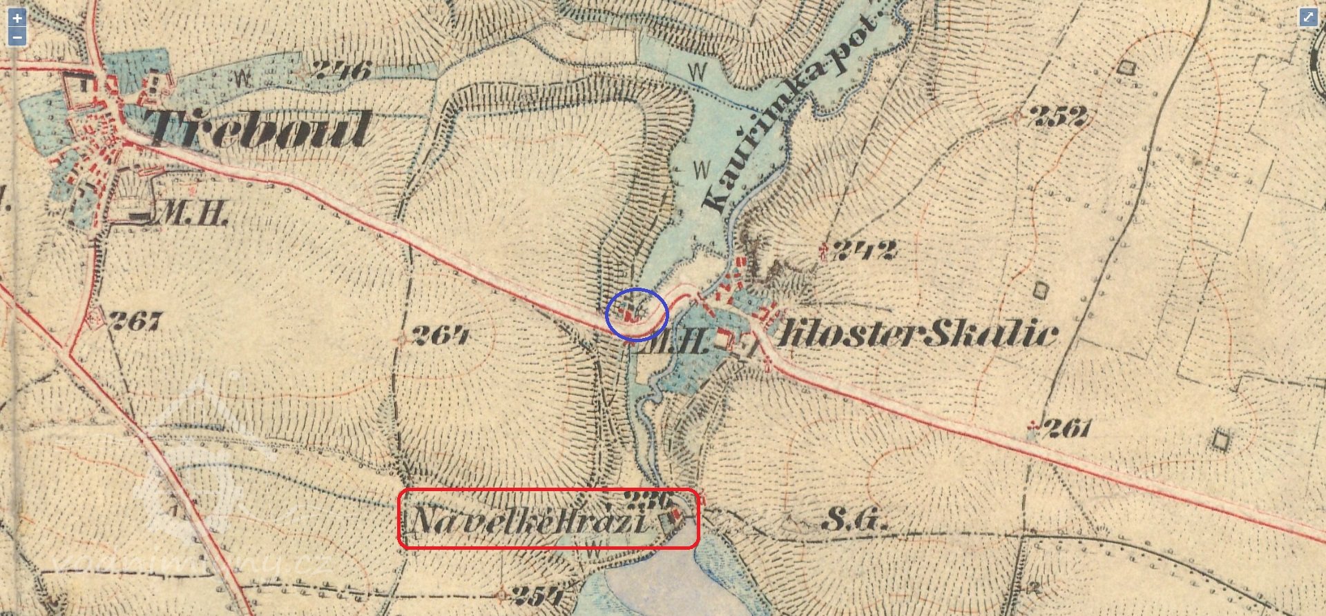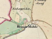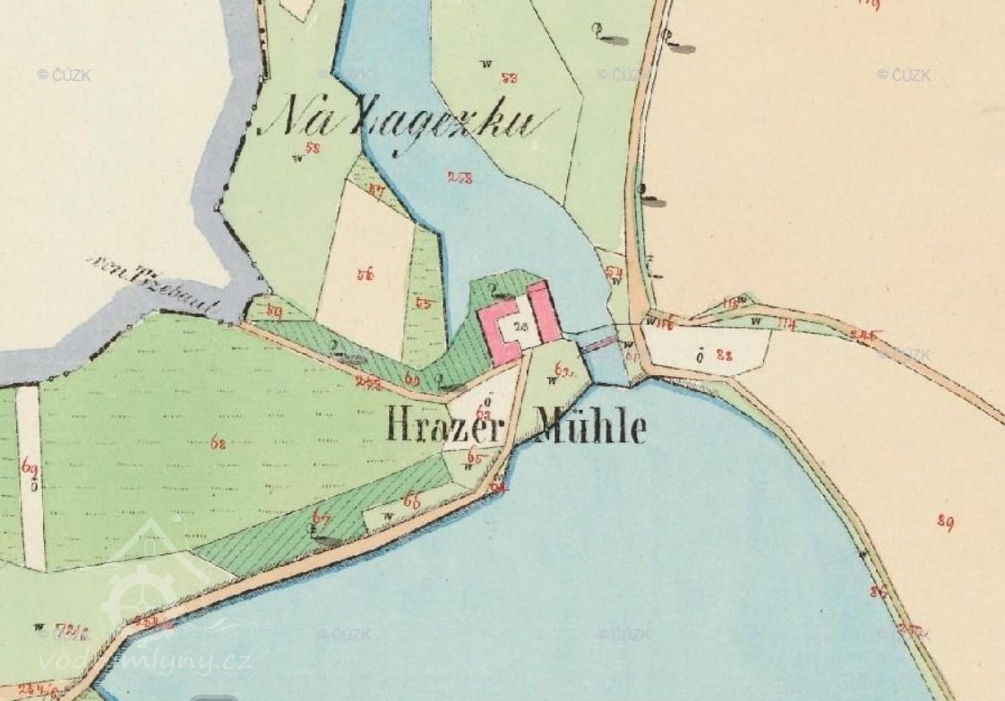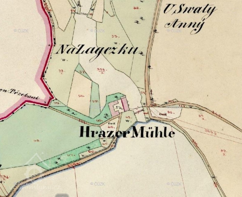 Hrázský mlýn byl vystavěn už r. 1489 pod mohutnou hrázi Velkého rybníka. Byl na čísi příkaz zbořen vojskem v roce 1953/54.
