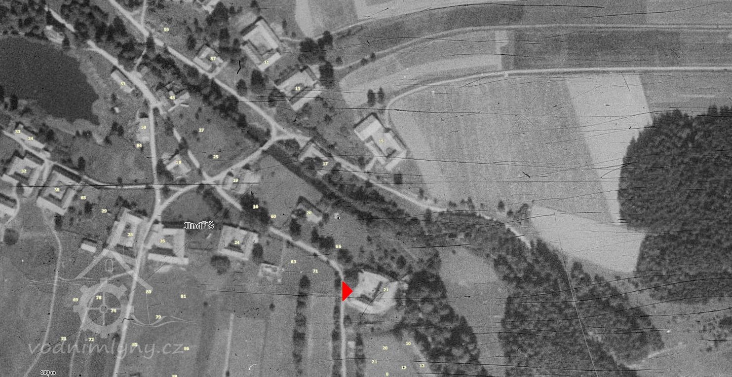 Mlýn stojí u Hamerského potoka na východním okraji obce s názvem Jinřiš . Od mlýna se směrem na východ proti proudu Hamerského potoka táhne asi tři kilometry dlouhé Jindřišské údolí, které je častým výletním místem obyvatel Jindřichova Hradce. První zmínka o obci Jindřiš je z roku 1285. Z mlýna se postupně stává ruina - střechy, krovy a stropy jsou propadlé, začínají se rozpadávat obvodové zdi.