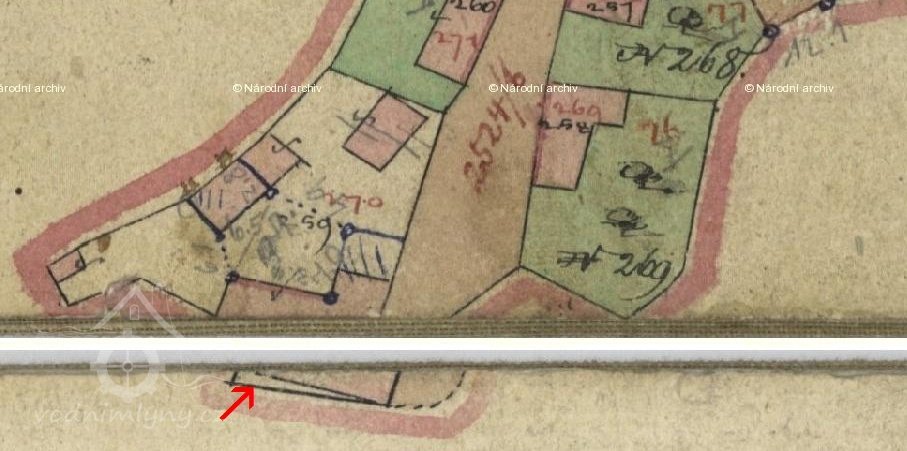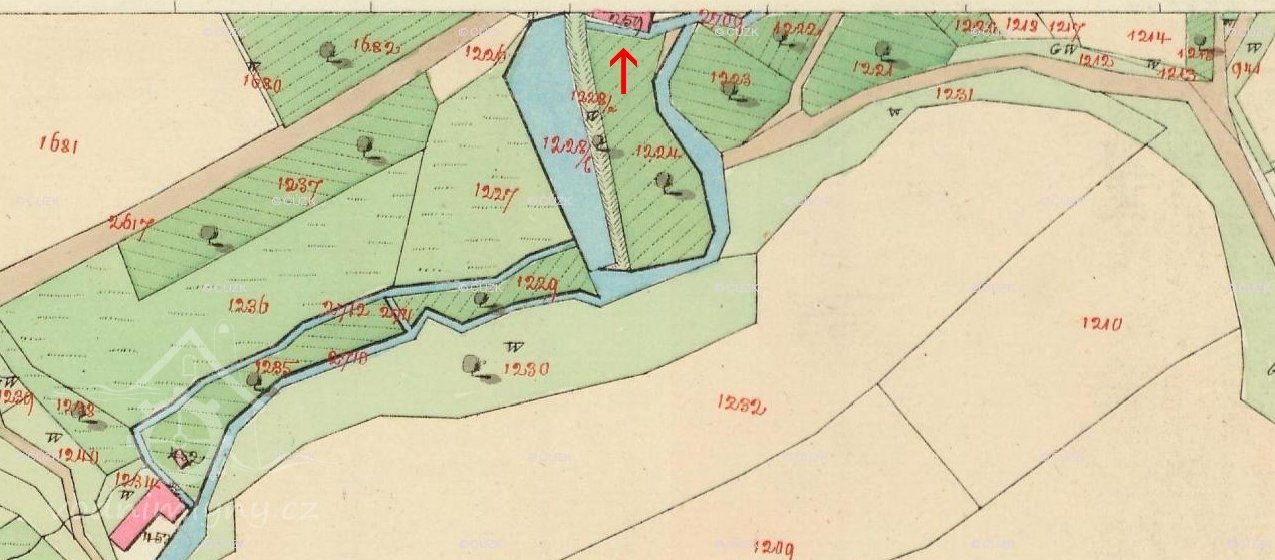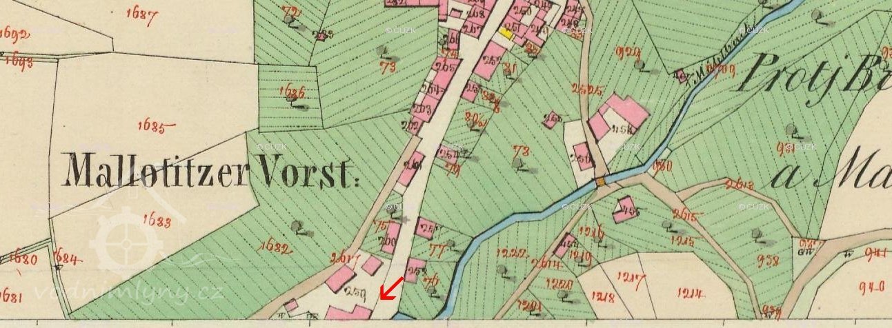 V roce 1930 zde bylo vodní kolo na svrchní vodu o hltnosti 105 l/s na spádu 5,5 m o výkonu 5 HP.