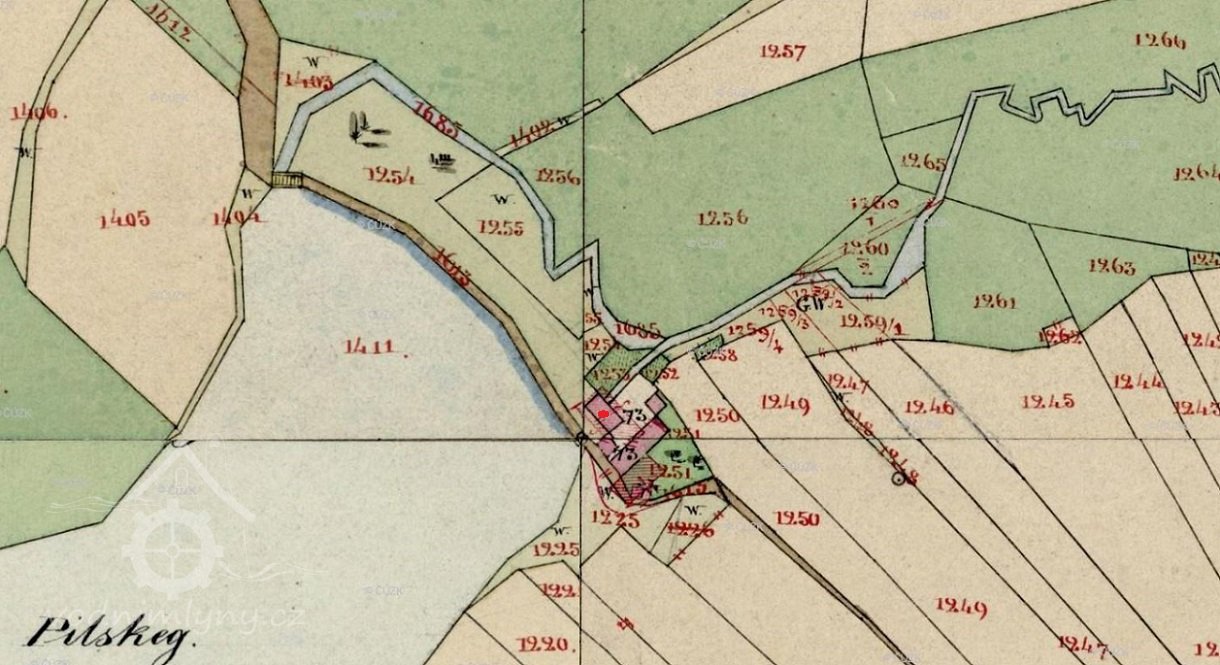 Popis1930: 1 kolo na svrchní vodu, hltnost 0,114 m3/s, spád 4,85 m, výkon 4,79 m