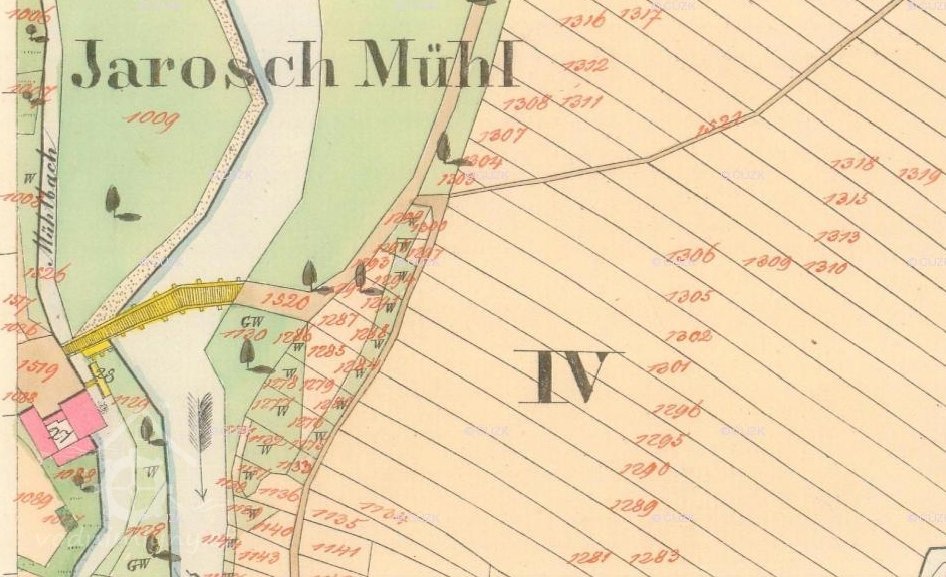 Na historických mapách je mlýn uváděn jako Jarošův (Iarosch Mühle).