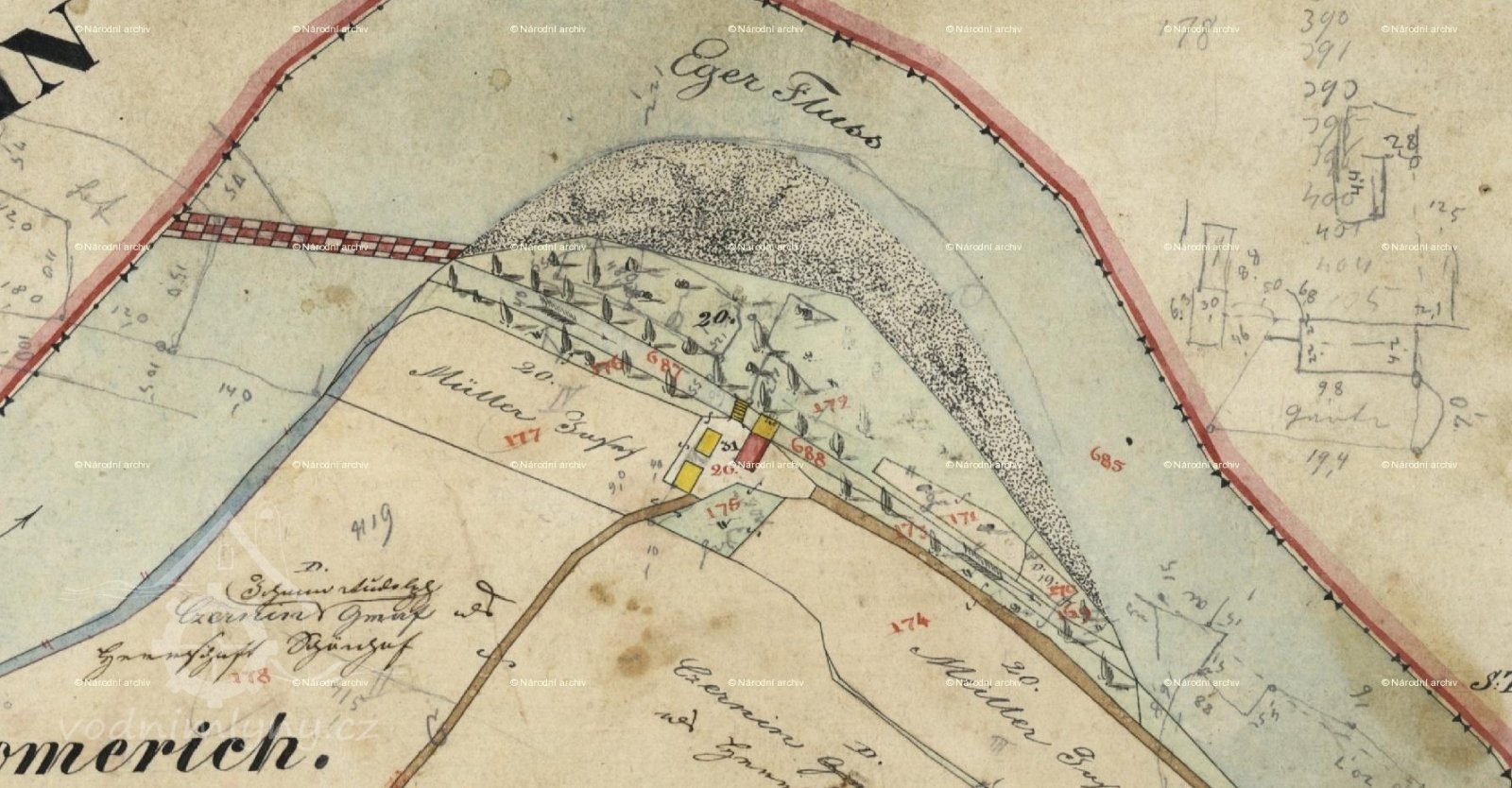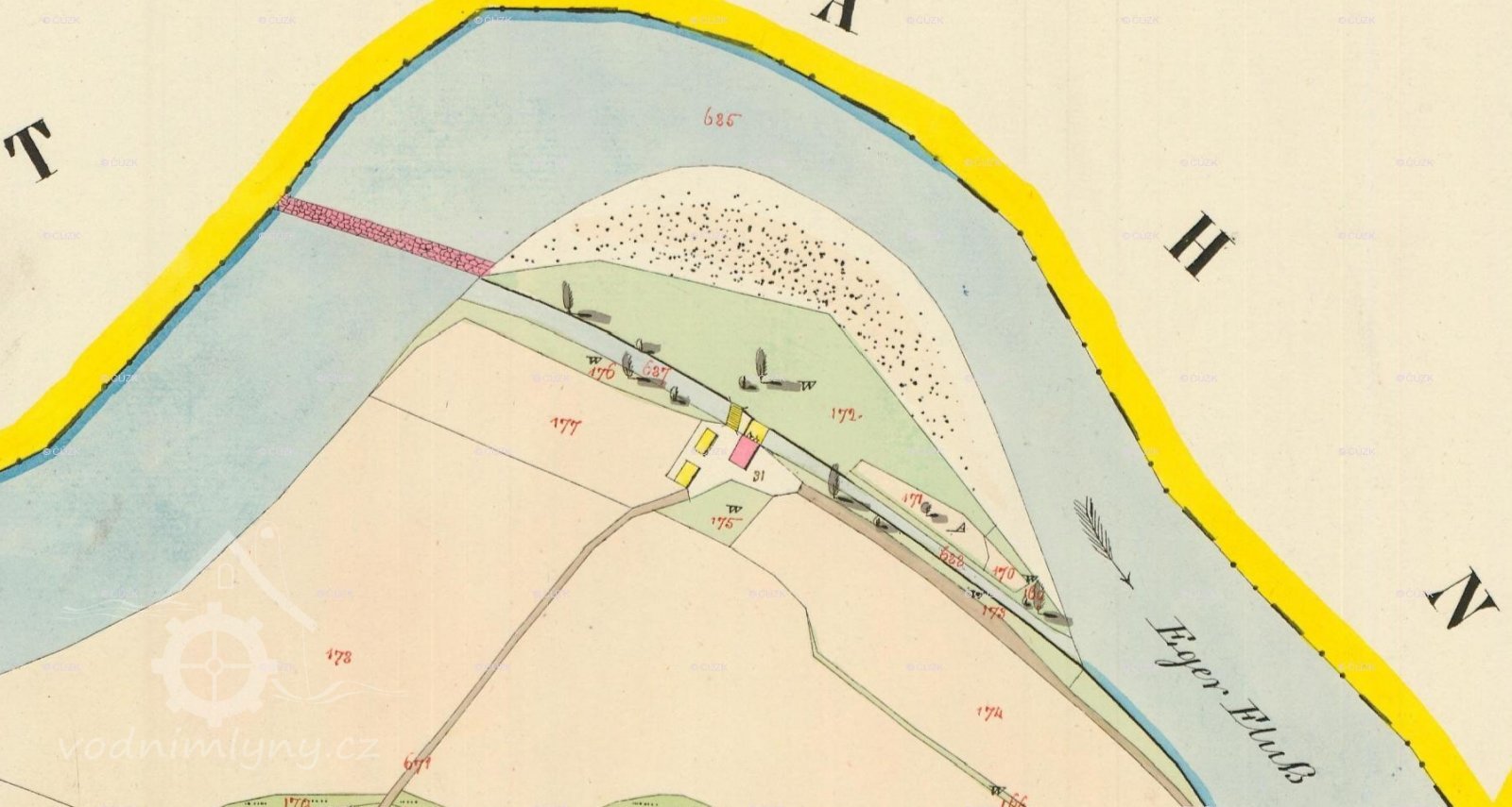 PopisV r. 1930 zde byla 2 kola na spodní vodu, průtok 2.284 m3/s, spád 1 m, výkon 9,6 k. (RR)