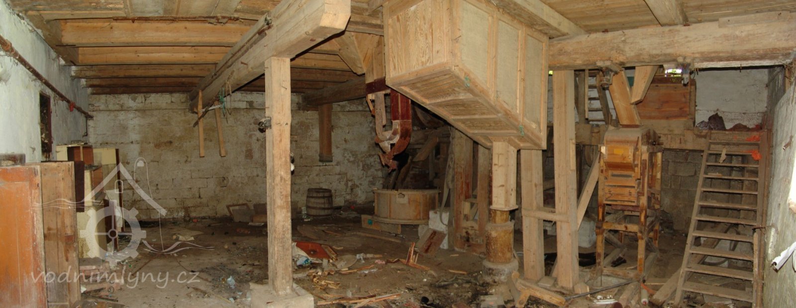 Dolní mlýnice: transmise, tarár, koukolník, který byl umístěn pod tarárem, elektrický motor pro záložní pohon transmise