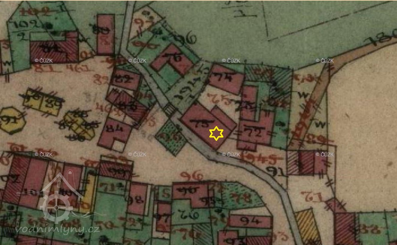 U města Třebechovic jsou 3 mlýny, "vrchní" Jana Veverky č. 80 na horní vodu, kanálem ze vzdáleného rybníka hnaný, bez jezu, pak "prostřední" mlýn na potoce Dědina Josefa Mayera č. 46 na spodní vodu a "dolní" mlýn Jana Sladomela č. 223 na spodní vodu na též vodě, oba každý s vlastním splavem.