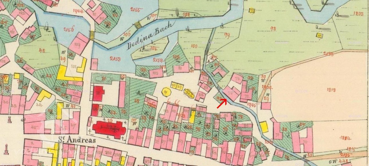 1598 obec koupila dům se dvorem od paní Tamchynové, přitom se připomíná kuchyňka, tj. haltýř pro chov ryb (odtud název "Na Kuchyňce")