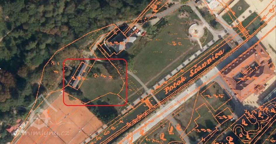 Na úpatí Malé Kamenné, historicky mimo obec 1400 m východně od zámku. Dnes v lázeňské zóně.