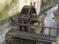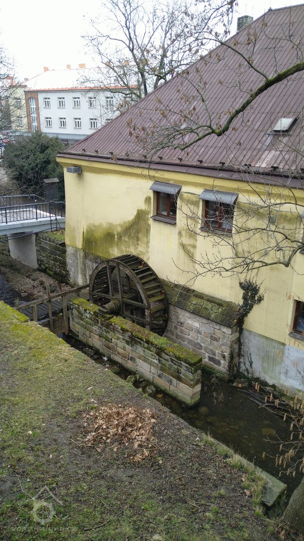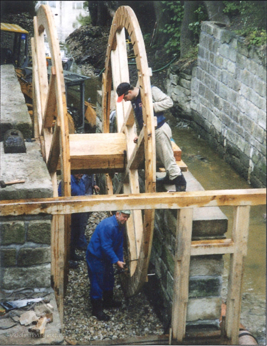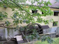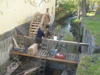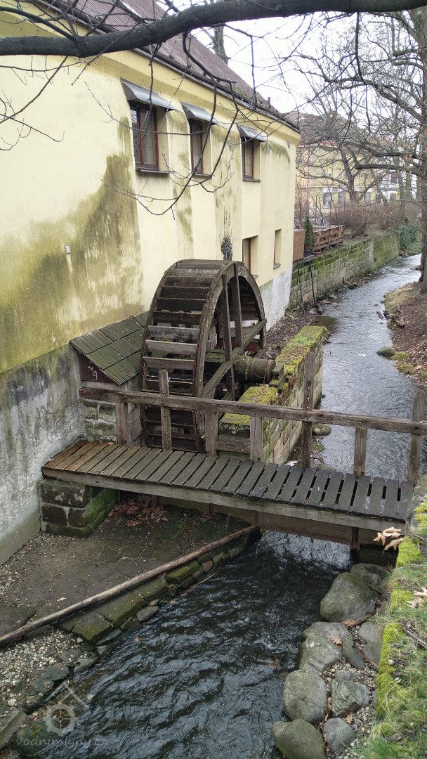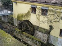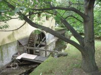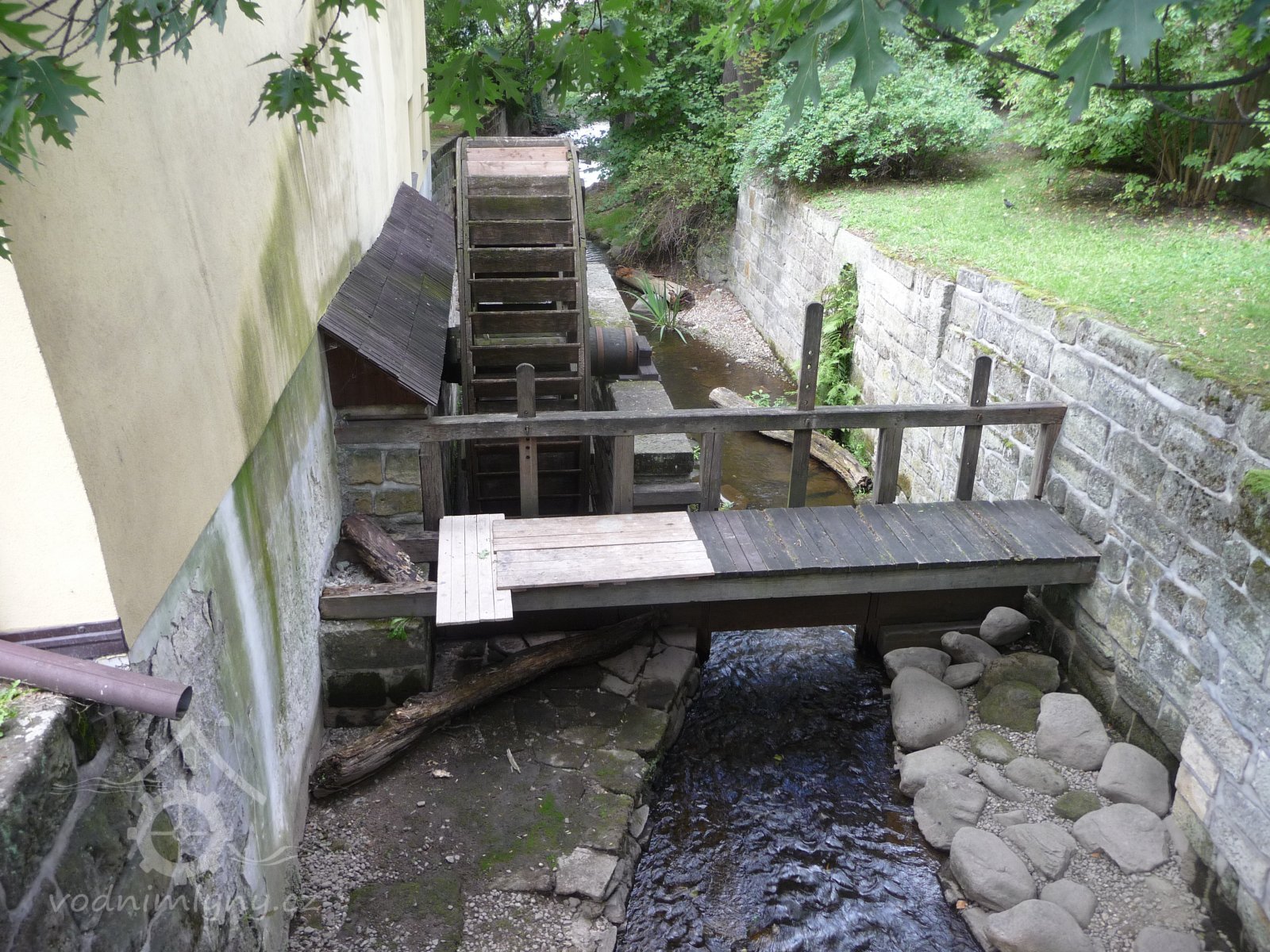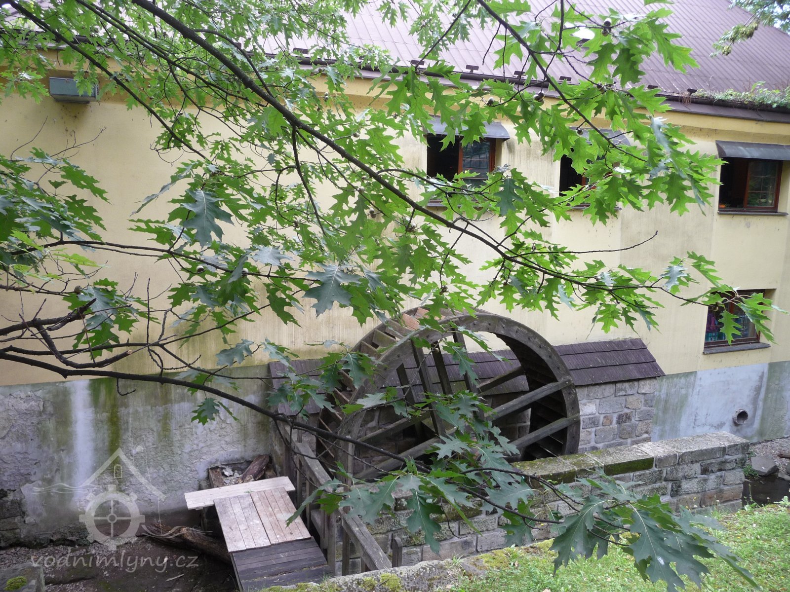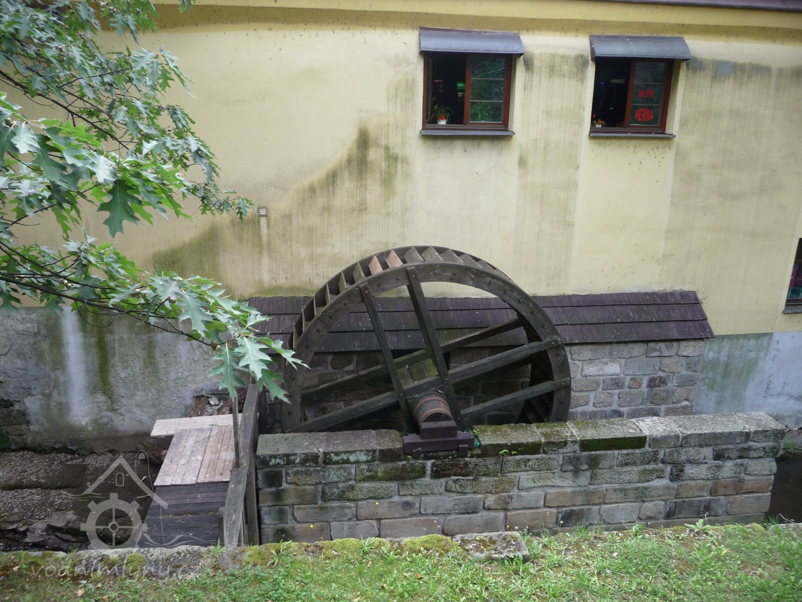 U mlýna je dnes obnovené vodní kolo na spodní vodu.