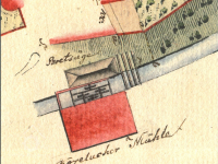 1810 mlýn o trojím složení s jahelkou a pilou prodáván "i s břehy olšovým a vrbovým stromořadím obzvláště od mlejna nahoru až k samým na Roštině stojícím lávkám" rodině Vamberových