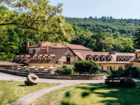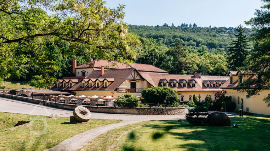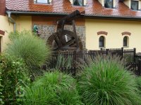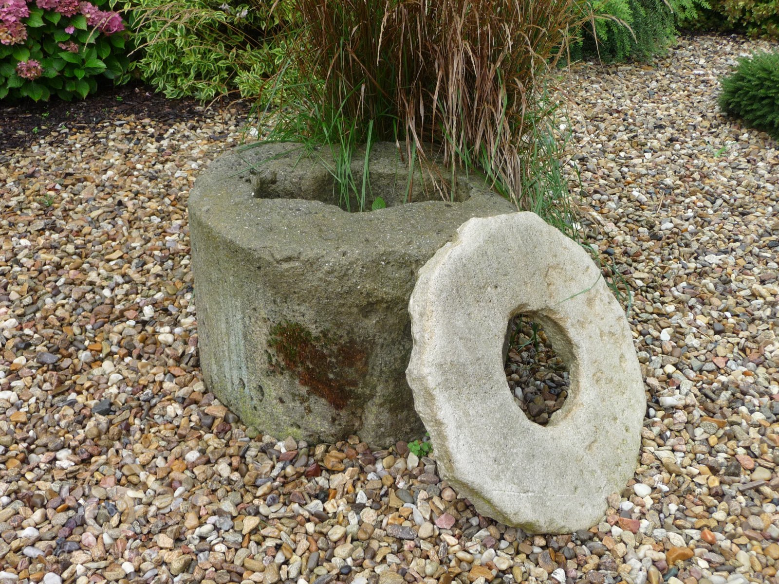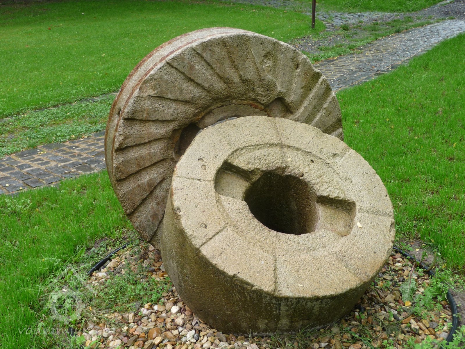 Na dvoře hotelu je umístěno několik mlecích kamenů.