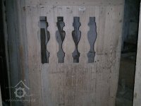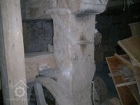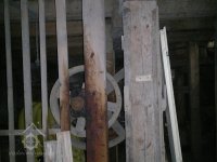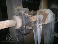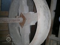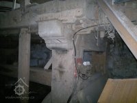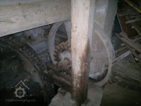 f) transmisní hřídel se 4 dřevěnými řemenicemi,
