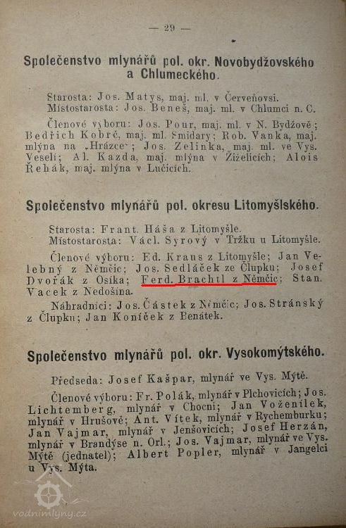 1899  - Ferd. Brachtl, člen výboru Spolku mlynářů pol. okresu Litomyšlského, (Fr. Duška, Kapesní kalendář mlýnů česko-moravských, r. 1899) (HŠ)