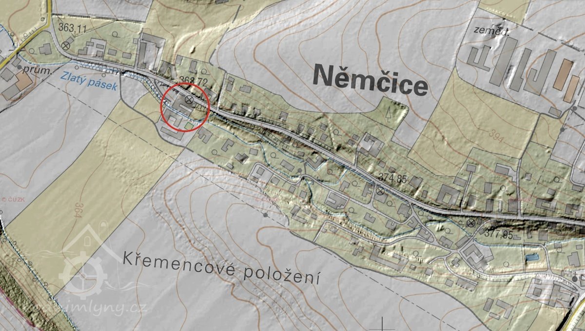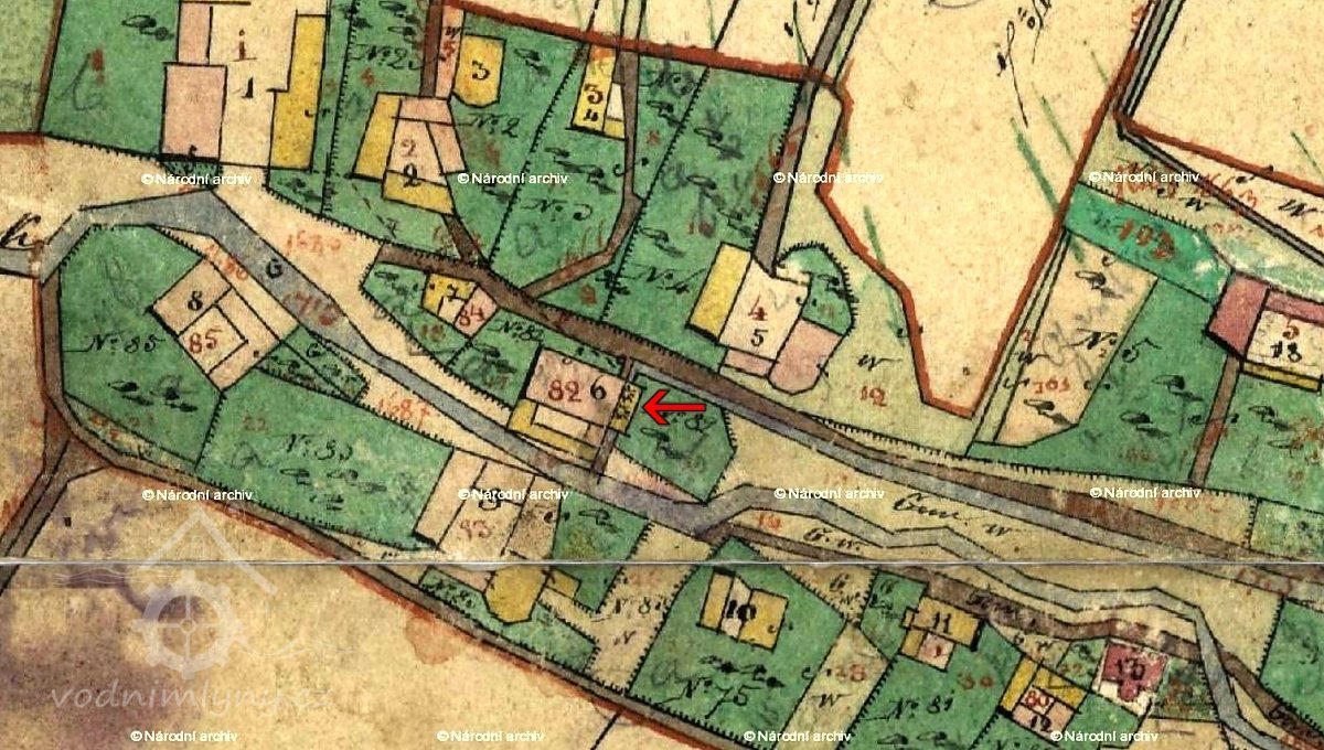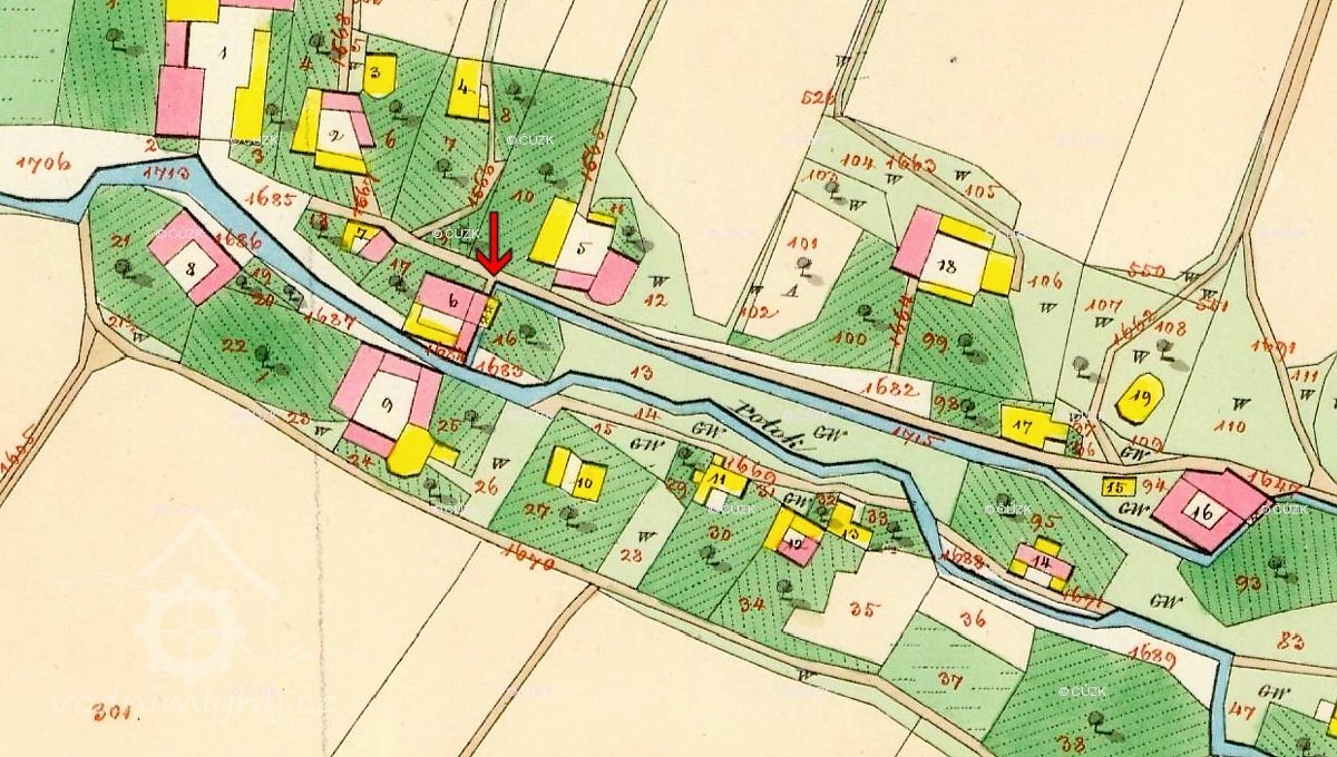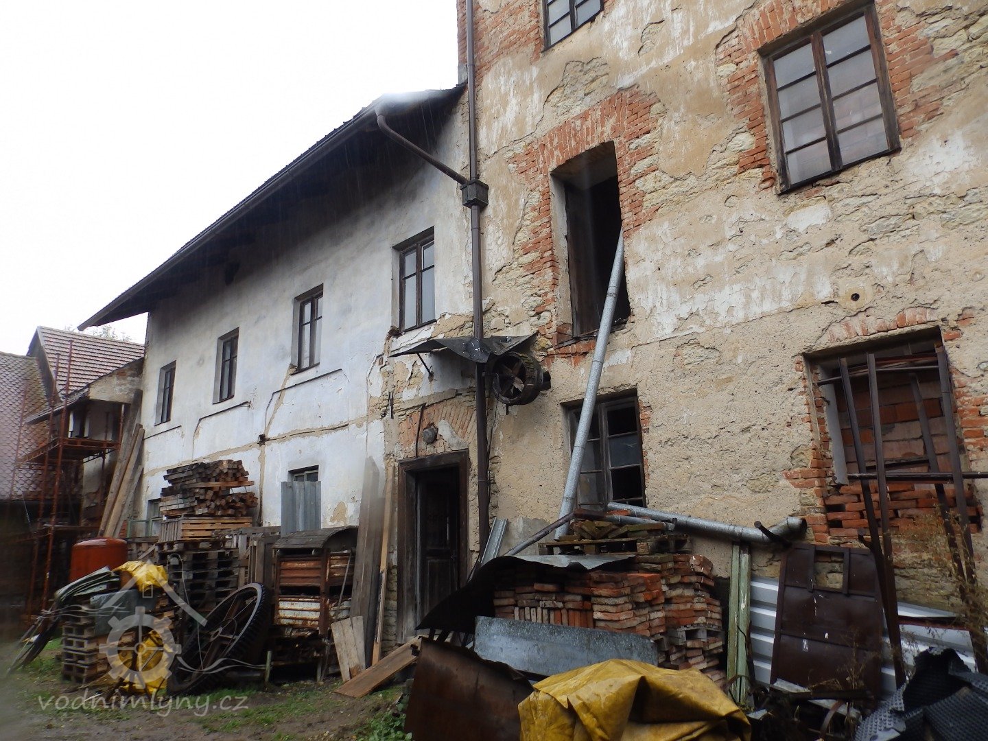 Mlýn tento nemá vody od mlýna č. 7 v Němčicích s kterým na společném náhoně leží přicházející. Kvůli jalovému odpadu v čase nutných oprav na mlýně , nalézá se před tímto v levém břehu náhona mezi zahradní parcelou a obecní č. 10 splávek jehož práh na dně řečiště zavázán jest. Splávek tento jest 80 cm široký, podlahou 1,65 m dlouhou opatřený, až k pouchu 35 cm vysoký. Před mlýnem nalézá se vantroka 1,35 m široká 45 cm vysoká třemi žlaby opatřená. Z těchto jest prostřední 35 cm široký jalový, kdežto pravý 42 cm vysoký a 35 cm široký vodu na dvě svrchnovodní 4,5 m vysoká kola. Odpadová voda spojuje se hned pod tímto mlýnem s jalovým potokem. V mlýně nalézají se dvě složení z nichž jedno jest poloumělé a přeskakovací krupník.