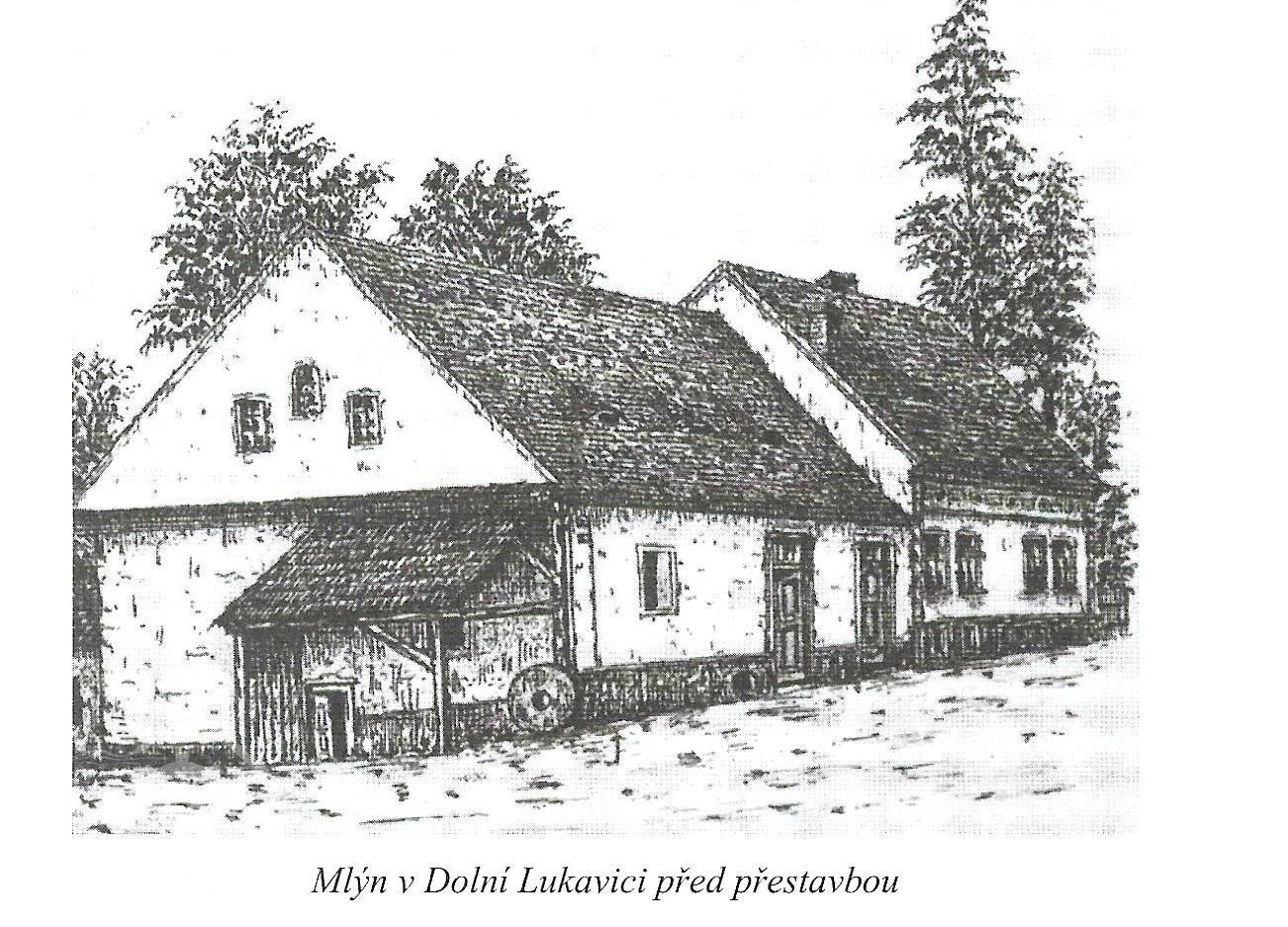1662 "Mlejn dolnolukavský, celý od kamene vystavěný, však v rohu a nade dveřmi roztrhnutý, na tři kola a čtvrté pro pilu. Však nemele, toliko na dvě kola, pilou též nedělá, poněvadž lesů, kdežby se špalíky k ní dělaly, nemá, aniž také přináležejícího železí k ní není..."
