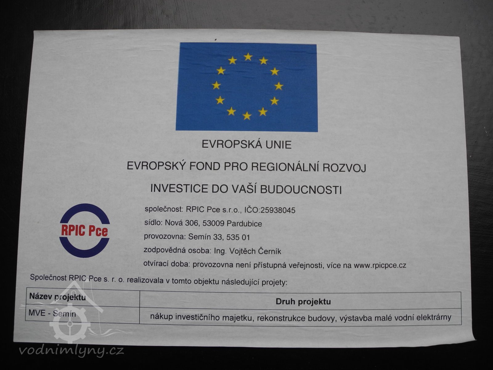 Technické parametry: instalovaný výkon 30 kWh, datum spuštění 2014, spád 3,6 m, hltnost turbíny 1,2 m3