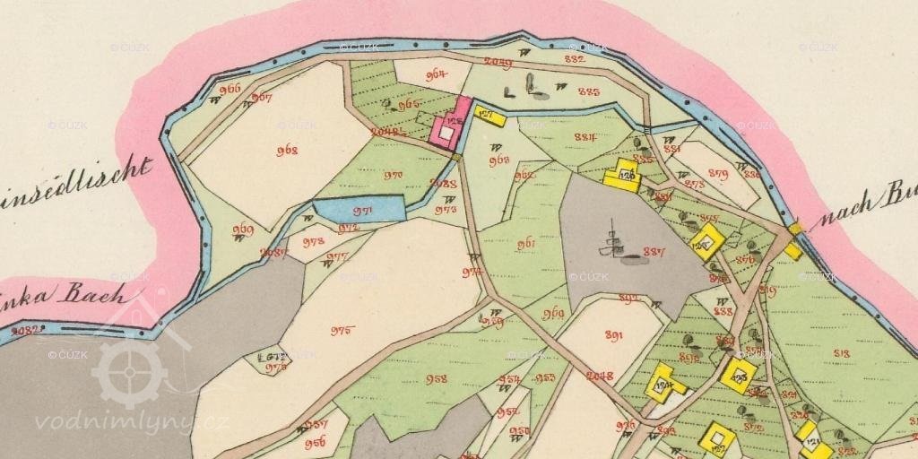 PopisV roce 1930 mlýn pohání kolo na svrchní vodu s průtokem 0.07 m3/s, spádem 5 m o výkonu 4 k.