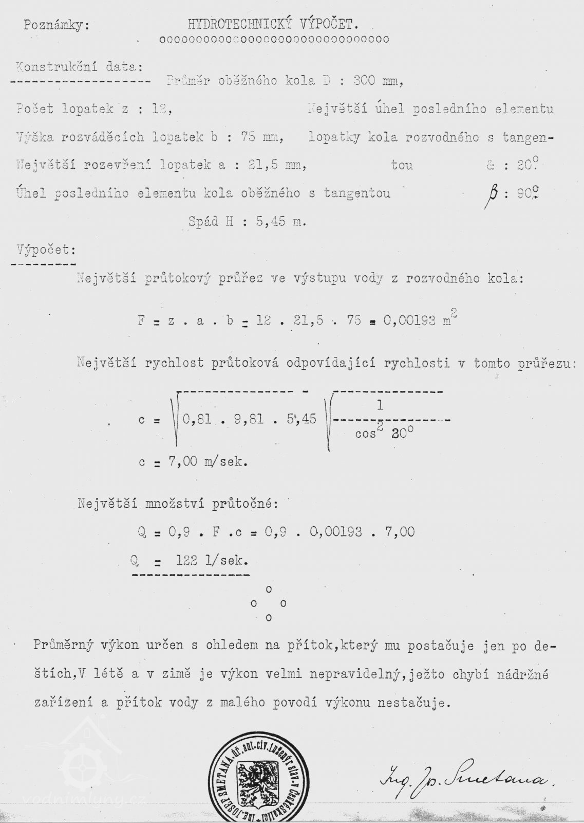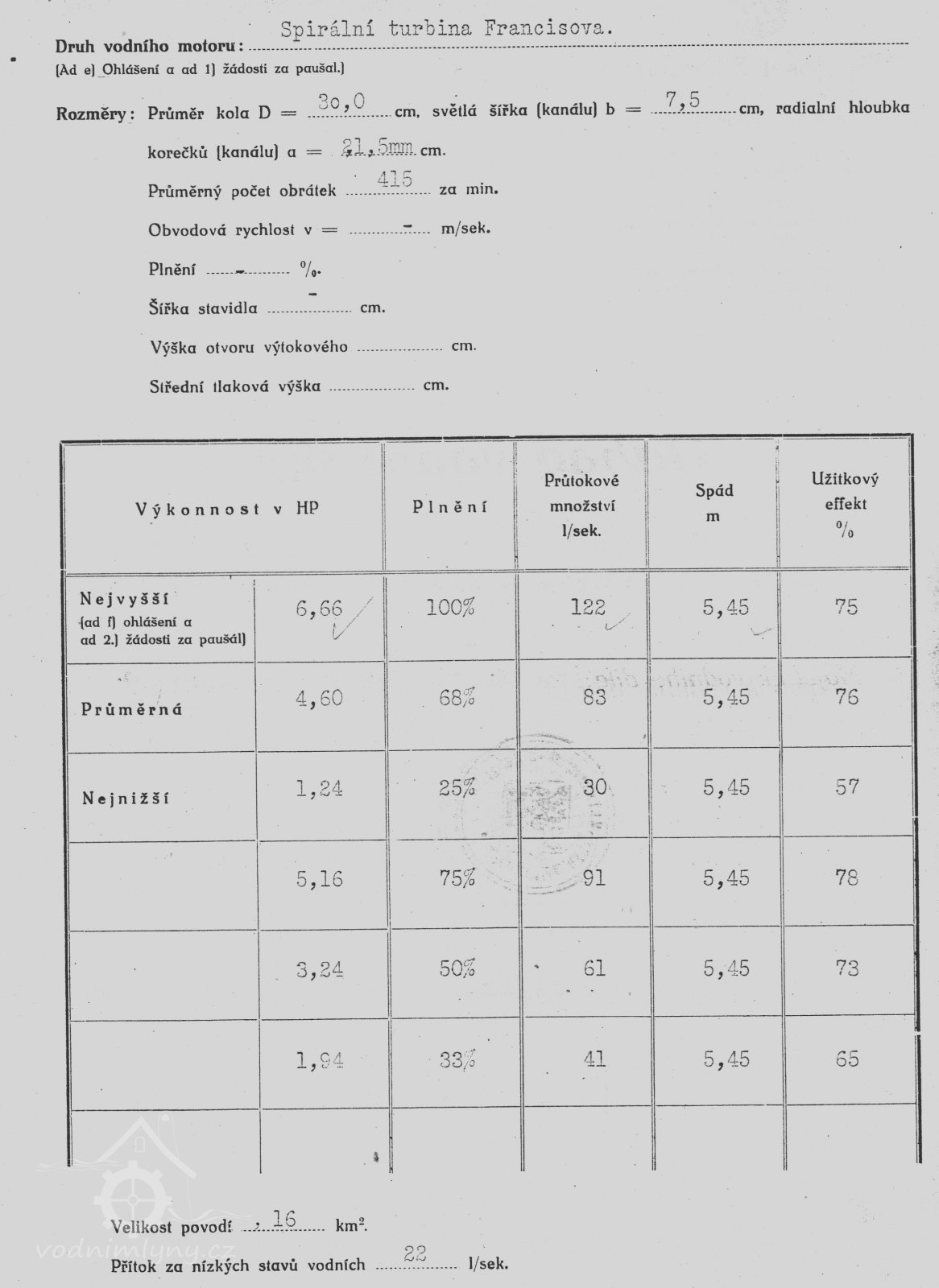2) hltnost 0,122 m3/s, spád 5,45 m, výkon 6,66 HP