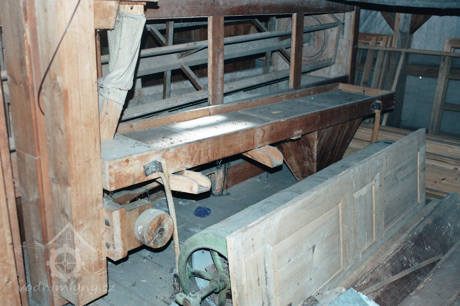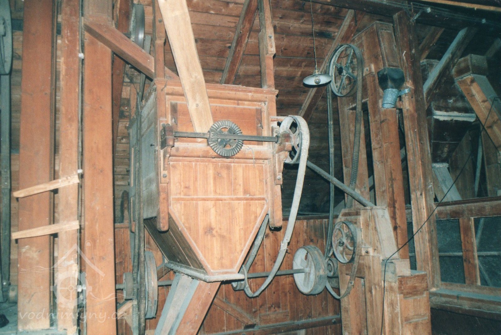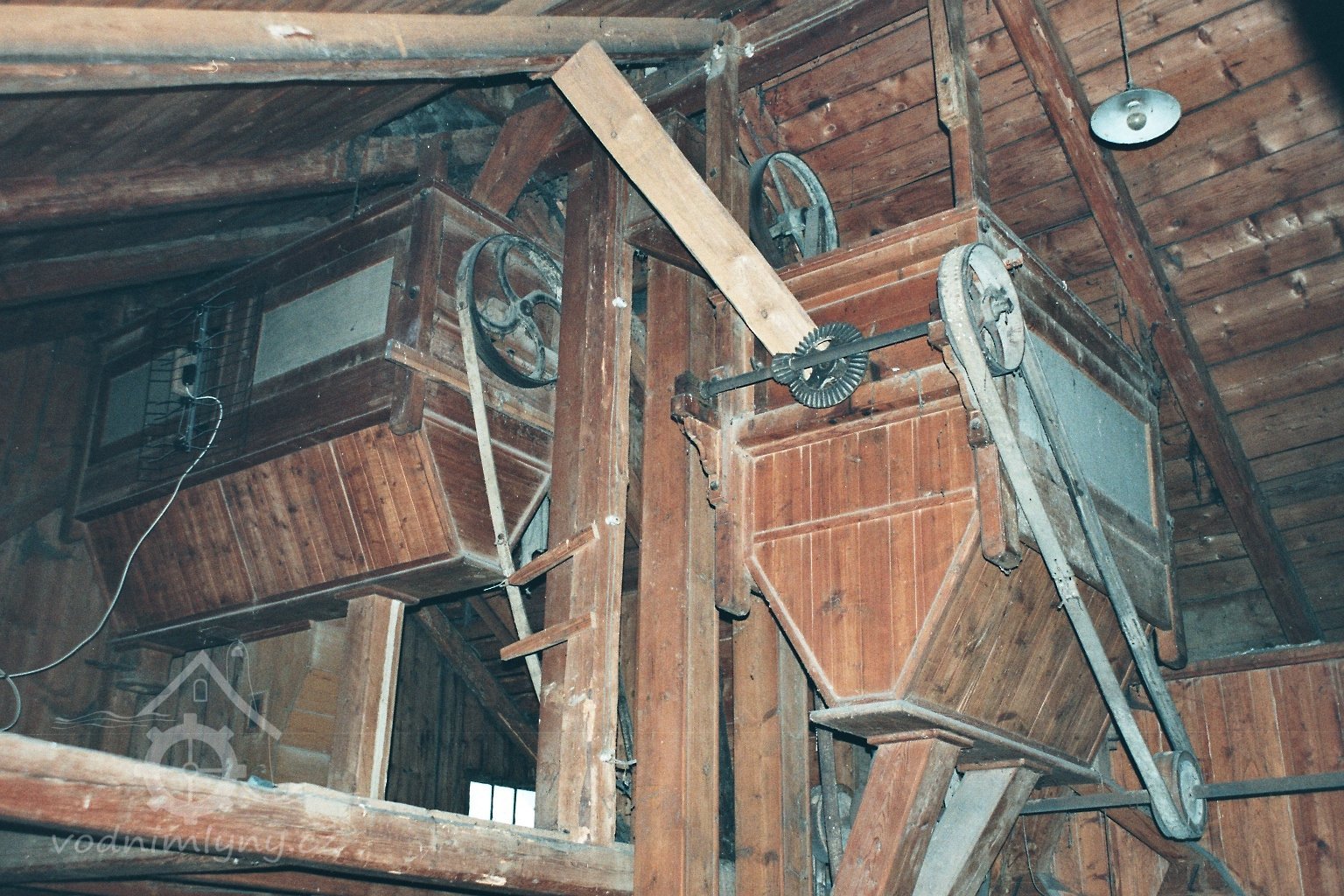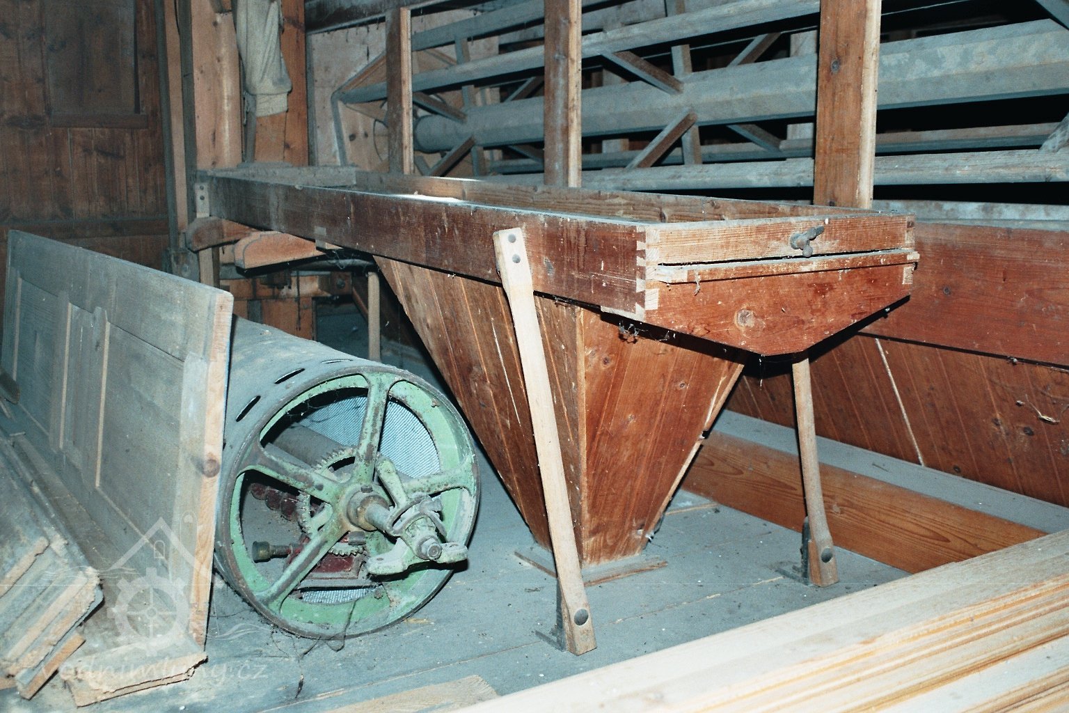 Podstřeší (podkroví) > Hlavy kapsových dopravníků, dopravníky jsou výroby Josef Macháček, Lukavice. Dále jsou zde šnekové dopravníky a zásobníky nad mlecí stolice, transmise.