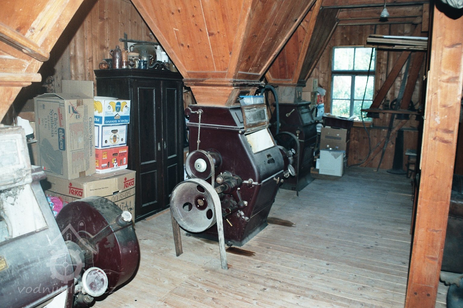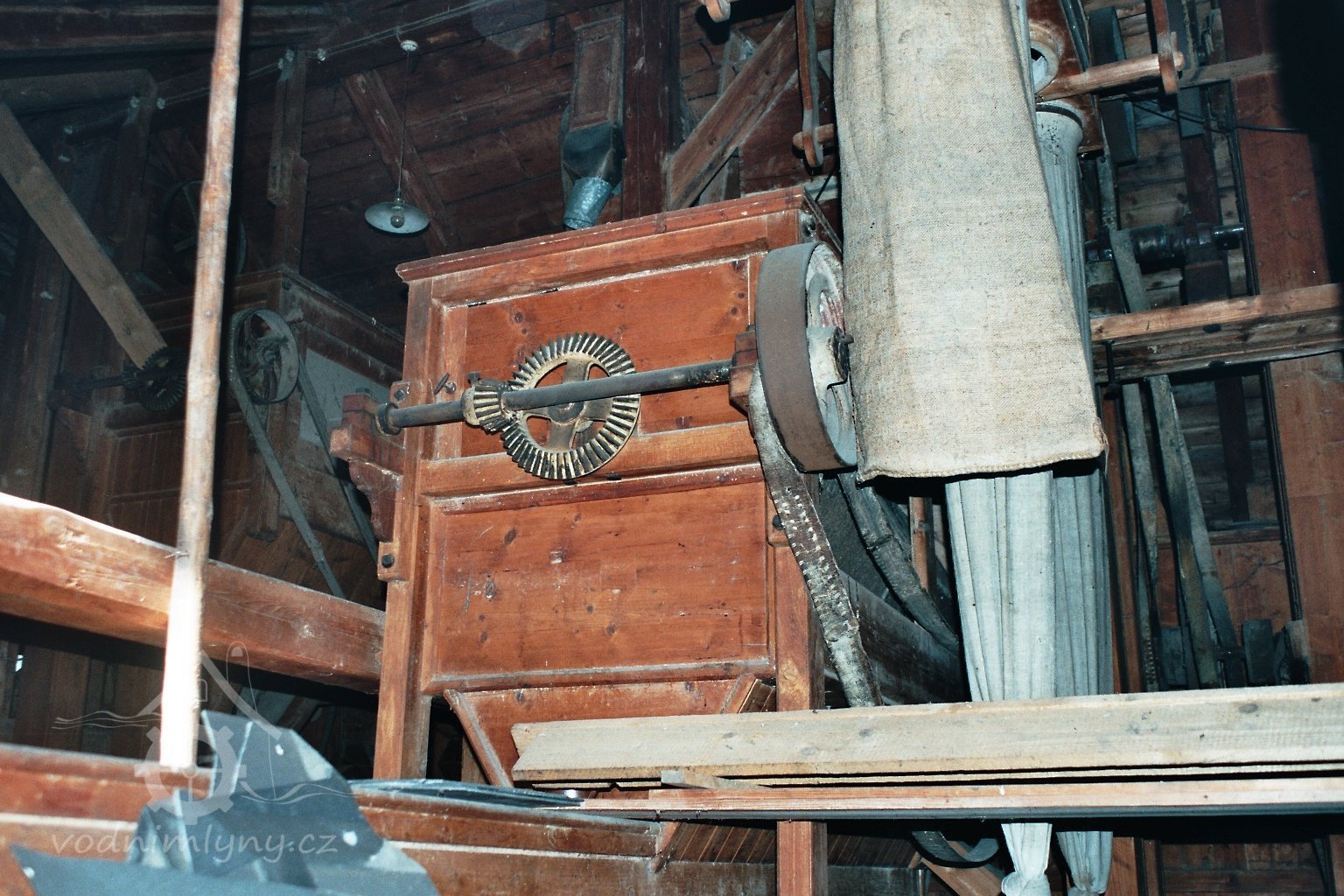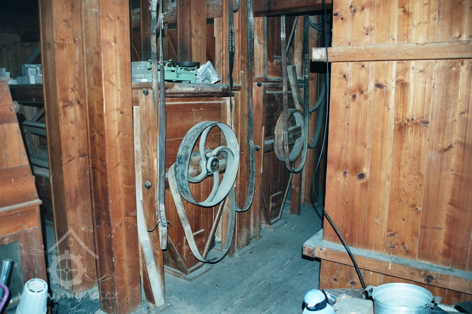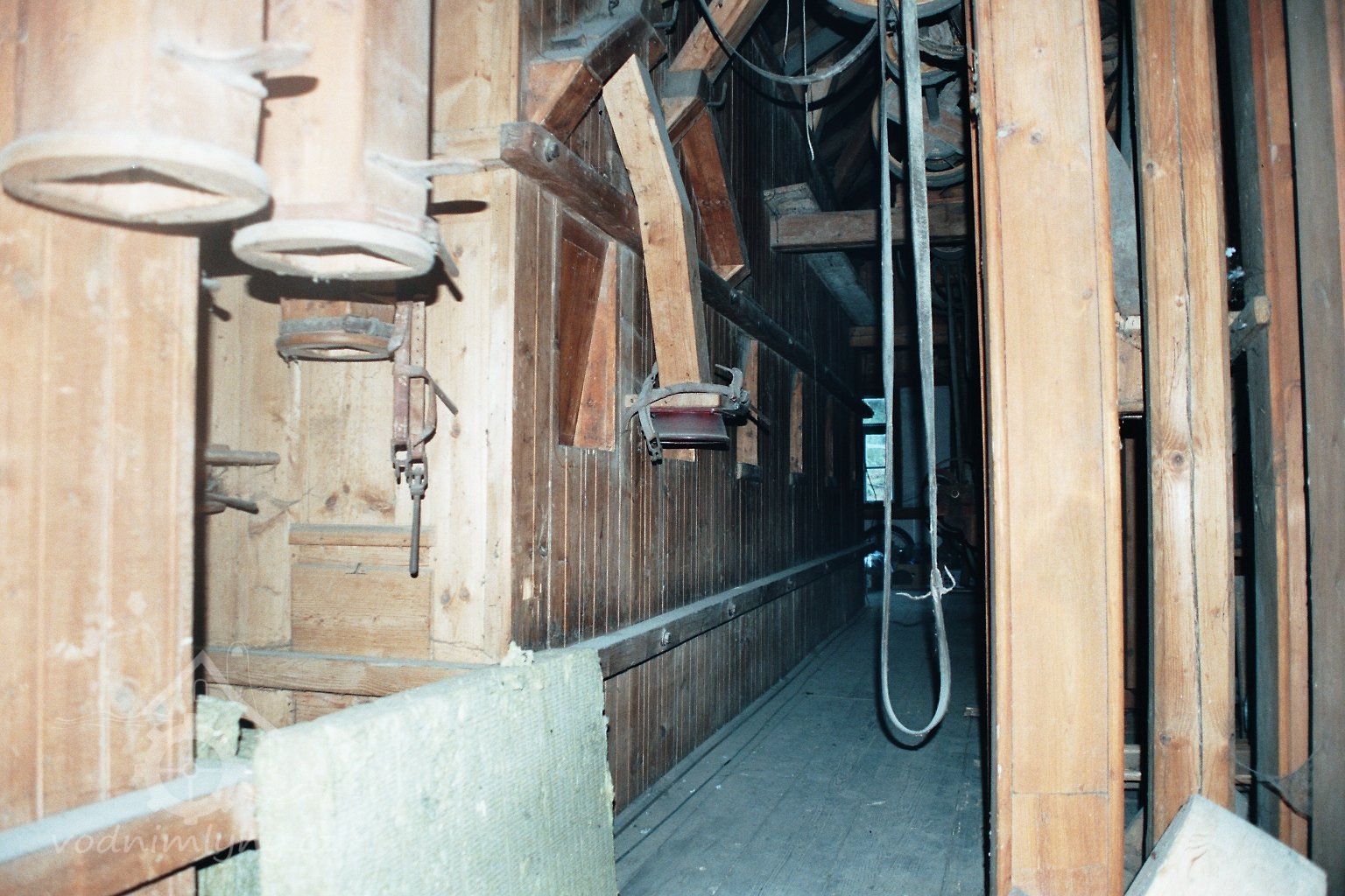 Podstřeší (podkroví) > Hlavy kapsových dopravníků, dopravníky jsou výroby Josef Macháček, Lukavice. Dále jsou zde šnekové dopravníky a zásobníky nad mlecí stolice, transmise.