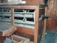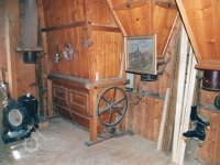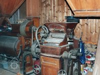 První podlaží > Mlecí stolice používaná k mačkání žita od fa Jan Prokopec, Praha – Vinohrady, rýhované válce Ø 300 mm, délka 400 mm v dřevěné skříni, výroba kolem r. 1885 (unikát).