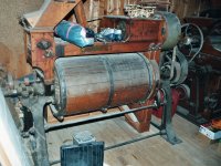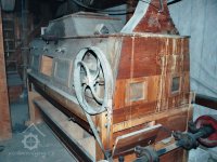 Šrotový vysévač na pšenici, výroba Josef Macháček - Lukavice, Ø 850 mm, délka 2000 mm, jako předvysévač k moučnému vysévači.