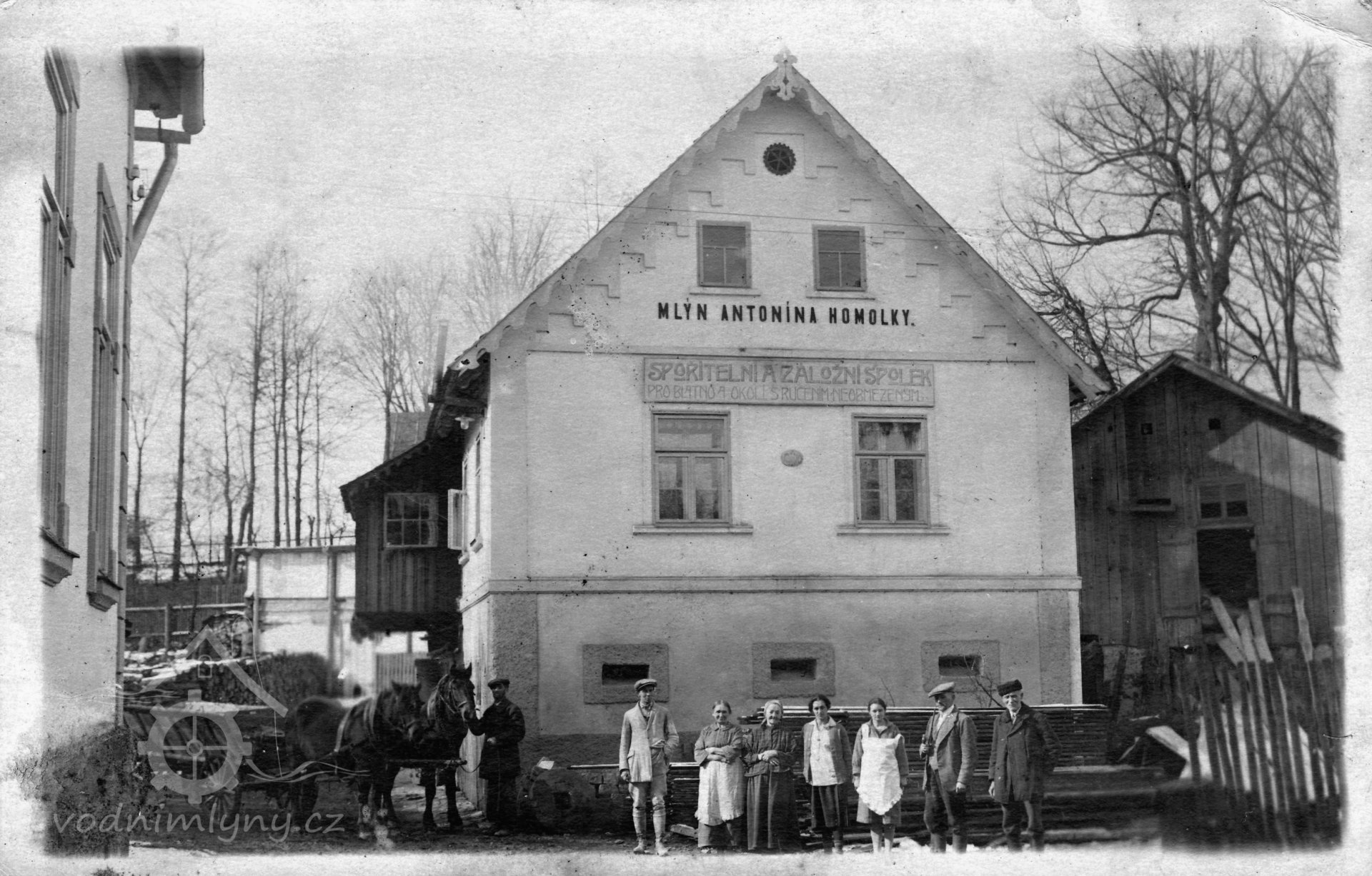 Mlynář Antonín Homolka v roce 1890 přestavěl původní roubený mlýn na zděný s novogotickým štítem a mlynářským symbolem.