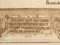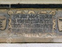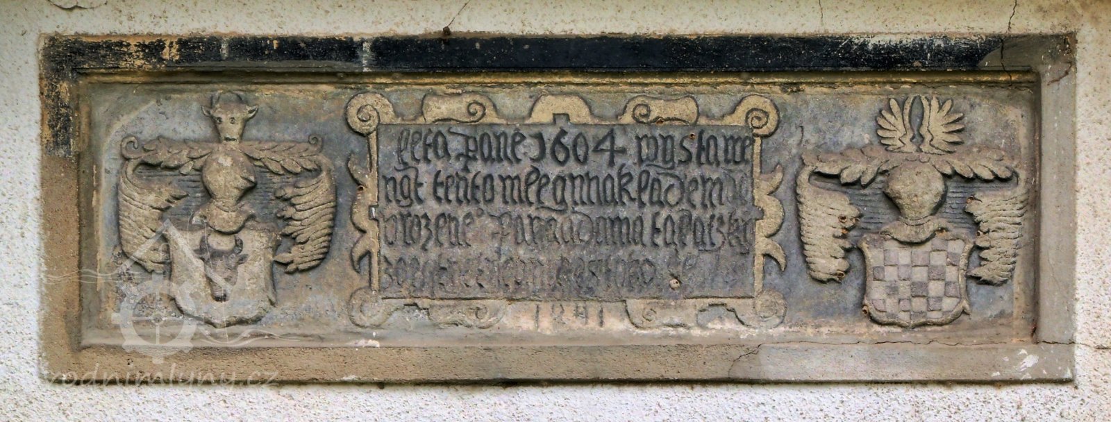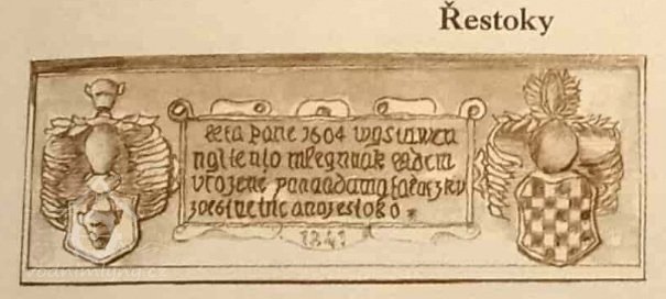 nápis na kamenné desce s erby: Léta Páně 1604 vystavěn jest tento mlejn nákladem urozeného pána Adama Talacky z Ještětic a na Řestokách