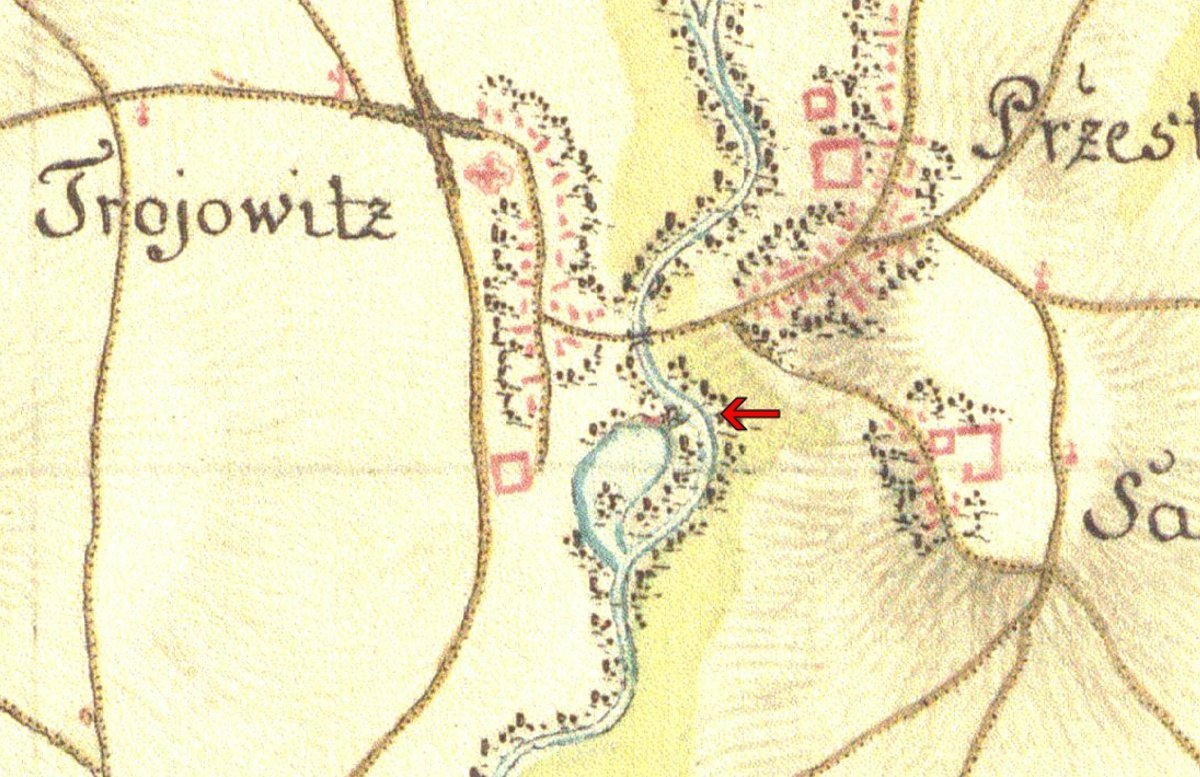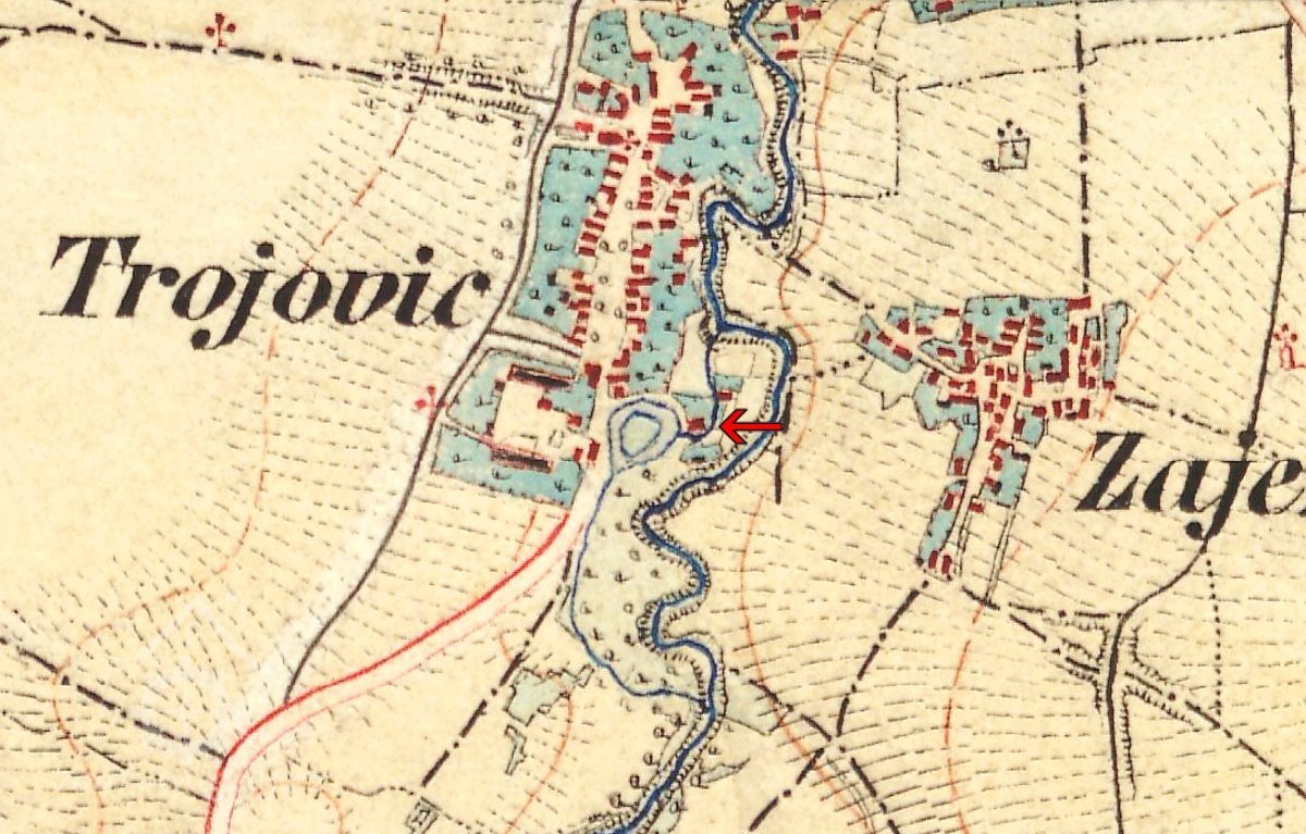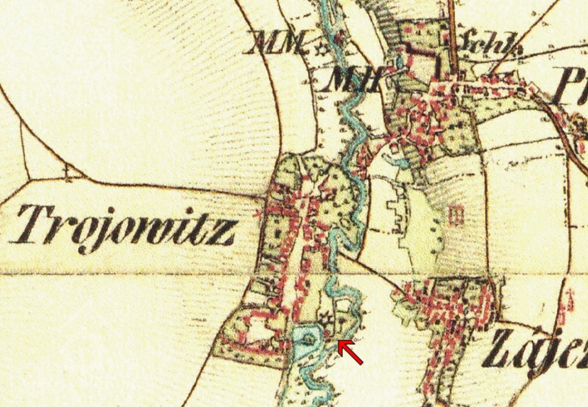 Mlýn je další ukázkou mlýna poblíž tvrze. "Trojovice patřily od roku 1551 Talackům z Ještětic. Jindřich Talacko přivtělil Trojovice k Týnci. Když zvýšil stav na řece tekoucí k Týnci, vyvedl ji z řečiště příkopem, který býval okolo tvrze trojovické (tvrz, archeologické stopy - nemovitá památka číslo 38907/6-4985) a vystavěl u příkopu tohoto mlýn." (A. Sedláček: "Hrady ... I.", str. 216).