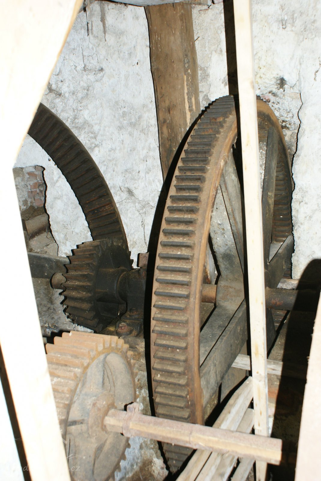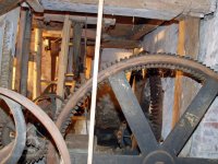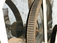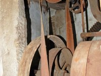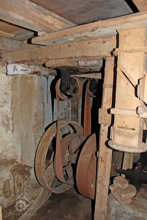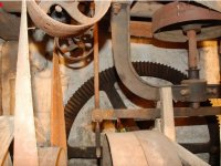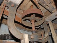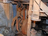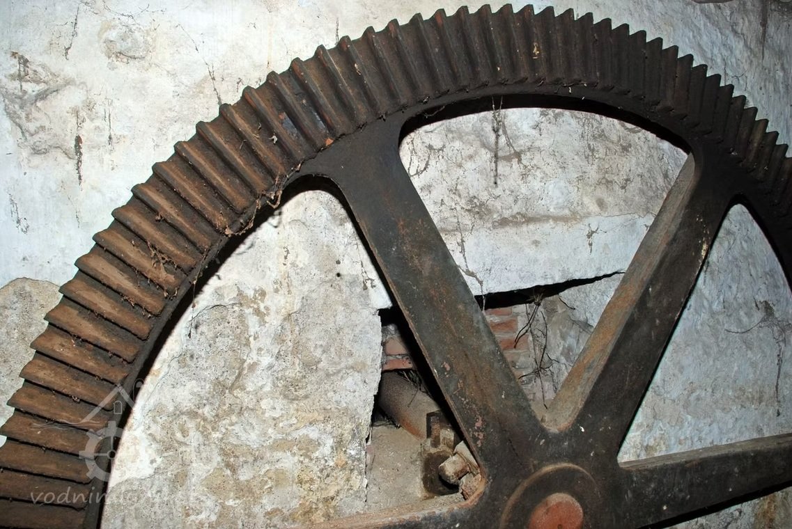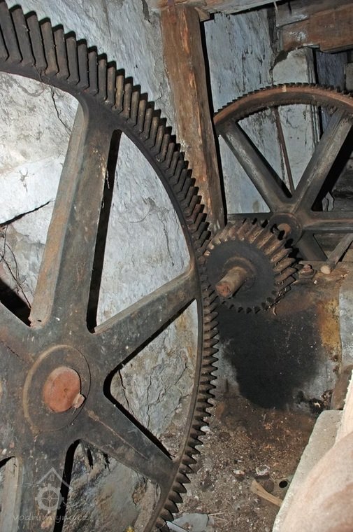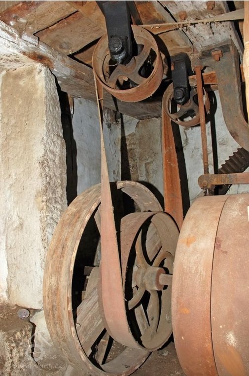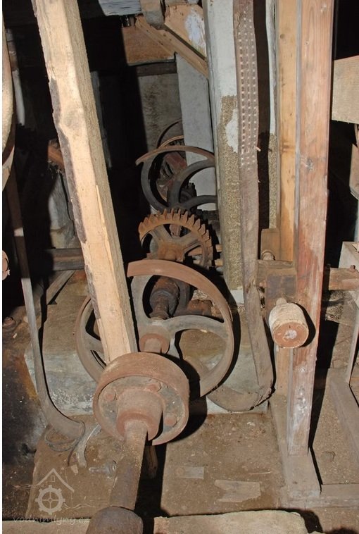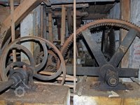 Převody s litinovými věnci osazenými dřevěnými palci, na které navazují litinové pastorky, 2010, © Urbánek, (Prvky na obrázku: transmise, řemenice, převody)