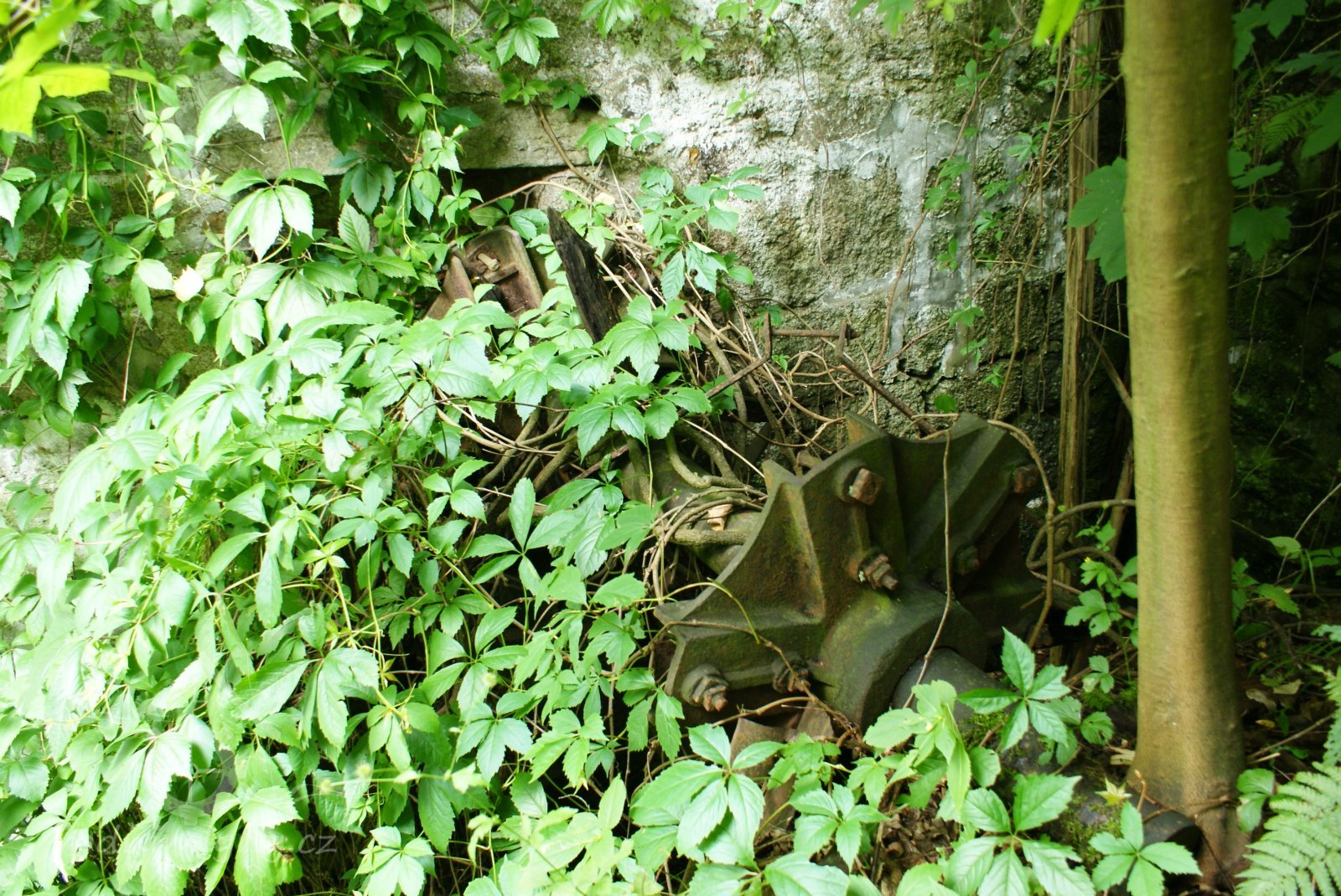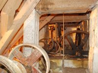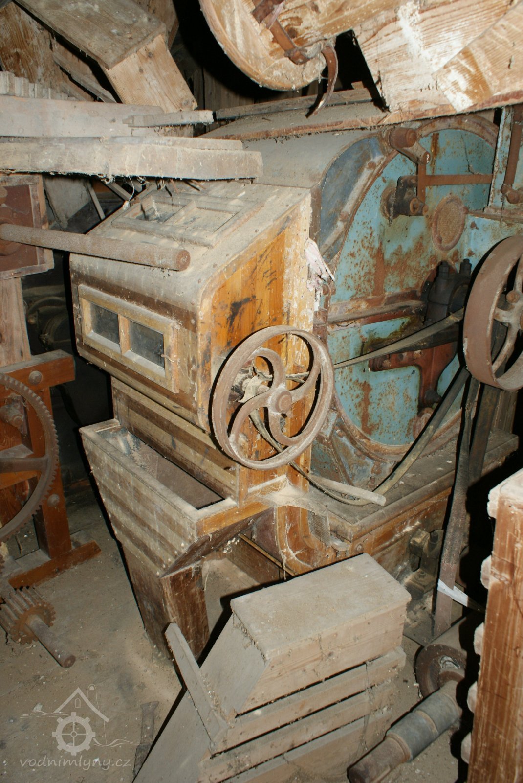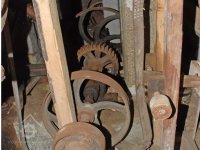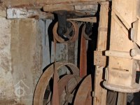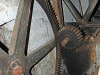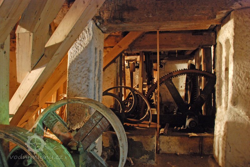 Převody s litinovými věnci osazenými dřevěnými palci, na které navazují litinové pastorky, 2010, © Urbánek, (Prvky na obrázku: transmise, řemenice, převody)
