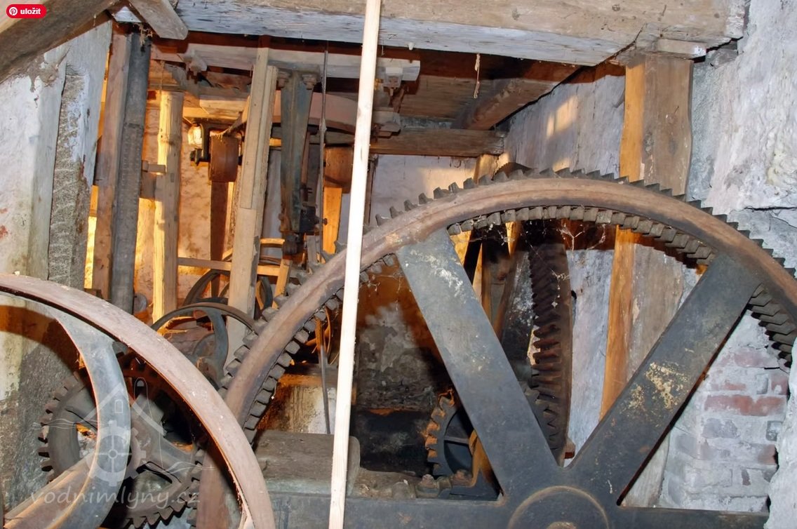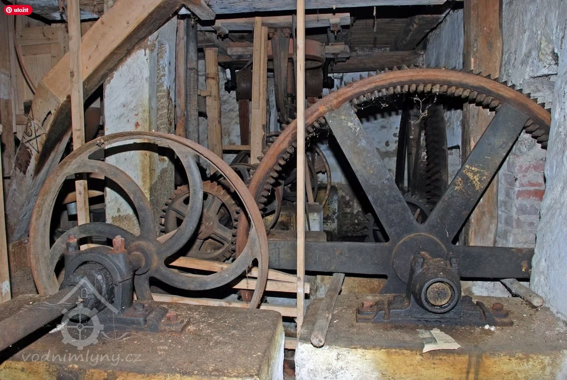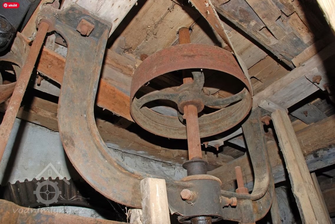 Interiér mlýnice, 05 2025, © Miroslava Pavlíková, (Prvky na obrázku: transmise, řemenice, převody)
