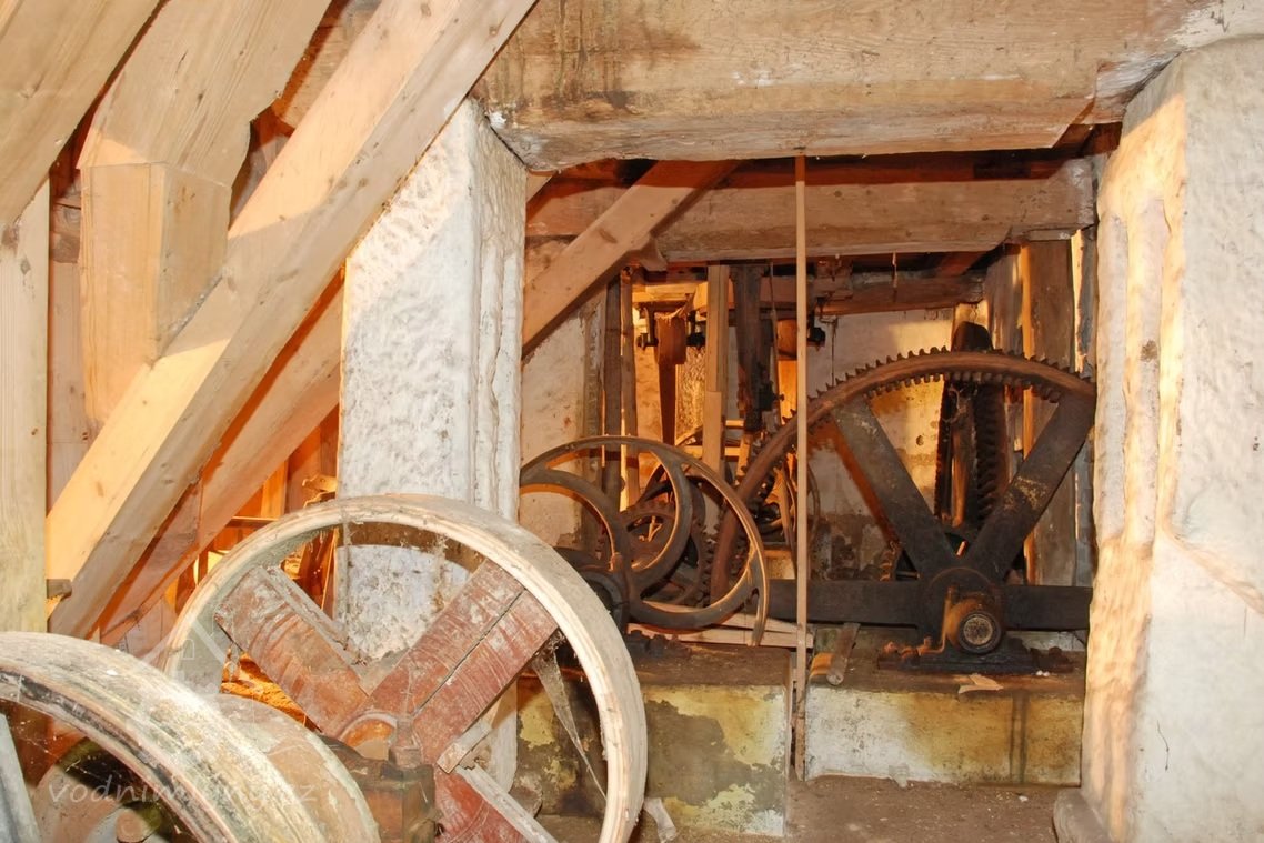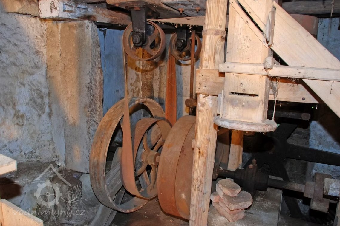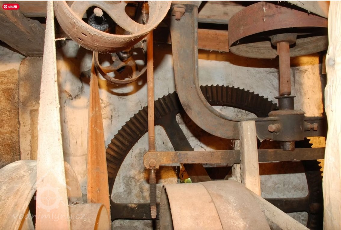Interiér mlýnice, 05 2025, © Miroslava Pavlíková, (Prvky na obrázku: transmise, řemenice, převody, výtahy a dopravníky)