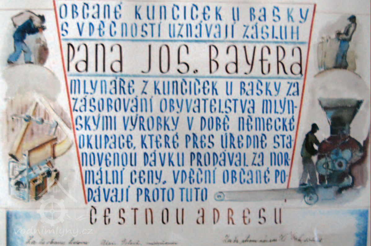 Ve válečných letech II. sv. války dokázal mlynář Bayer přes značné osobní riziko pomoci moukou mnohým občanům, zejména těm, kteří trpěli nouzí. Dodnes, jako památku na své rodiče, mají manželé Bayerovi na stěně svého pokoje zarámované uznání z června 1945, ve kterém se uvádí: „Občané z Kunčiček u Bašky s vděčností uznávají zásluh pana Josefa Bayera, (n. 28. 11. 1899 + 10.9. 1976) mlynáře z Kunčiček u Bašky, za zosobování obyvatelstva v době německé okupace, které přes úředně stanovenou dávku prodával za normální cenu. Za MNV: Alois Poloch, Klement Kondys, František Carbol, Karel Vichr“.