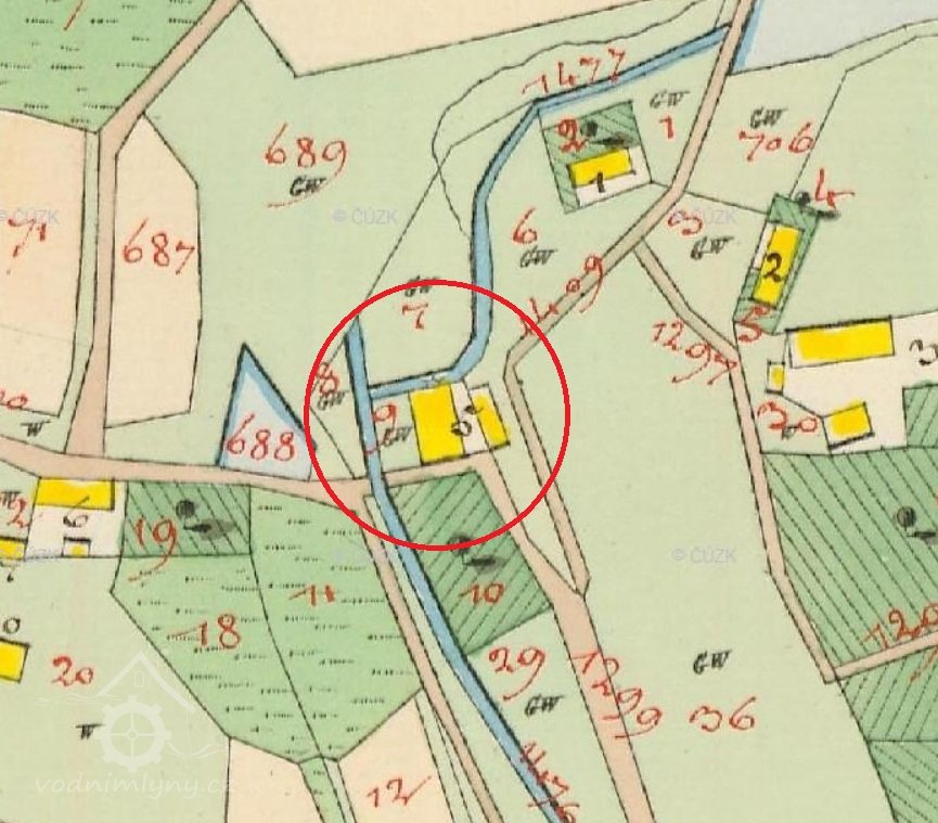 Popis1930: 1 kolo na svrchní vodu, hltnost 0,08 m3/s, spád 4,6 m, výkon 4 HP