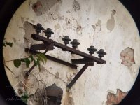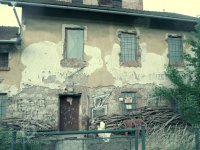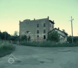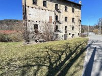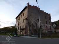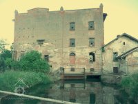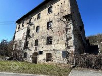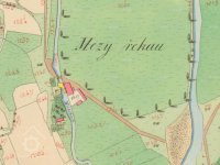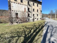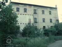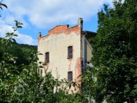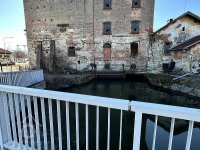 Část nad řekou má společnou zeď s jednopatrovou, sedlovou střechou krytou budovou, zřejmě historického mlýna.