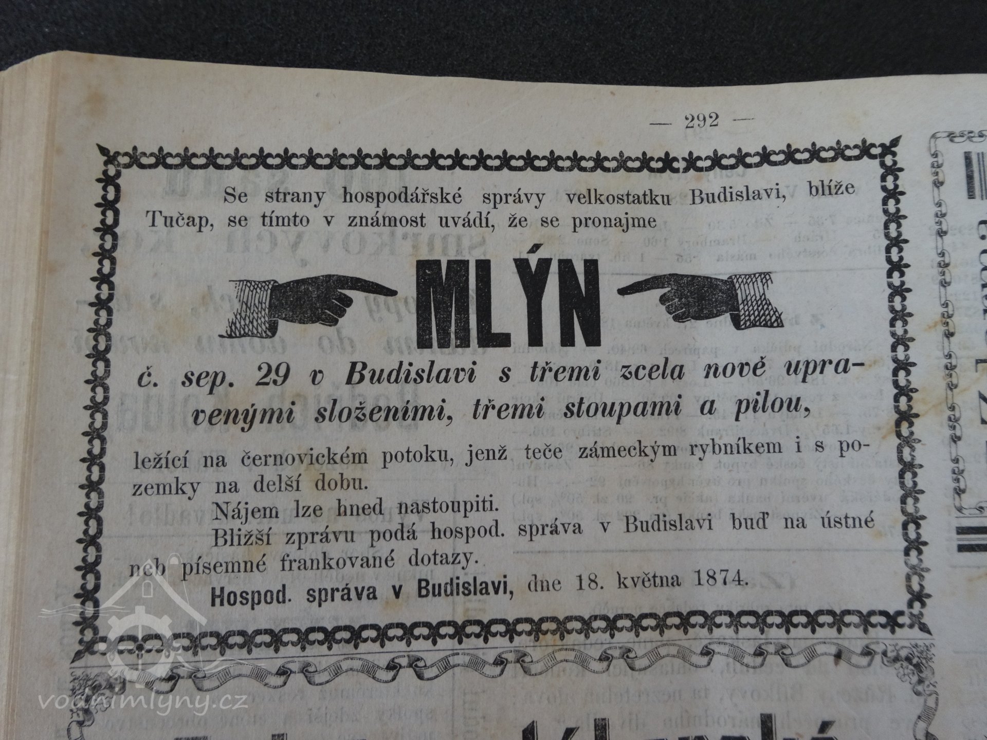 Jméno majitele mlýna a bydliště: Makovec Josef, Budislav 53, p. Tučapy