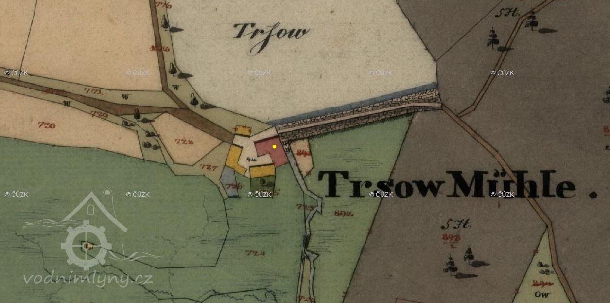 PopisV roce 1930 pohání mlýn kolo na svrchní vodu s průtokem 0.138 m3/s, spádem 4.3 m o výkonu 5.15 HP.