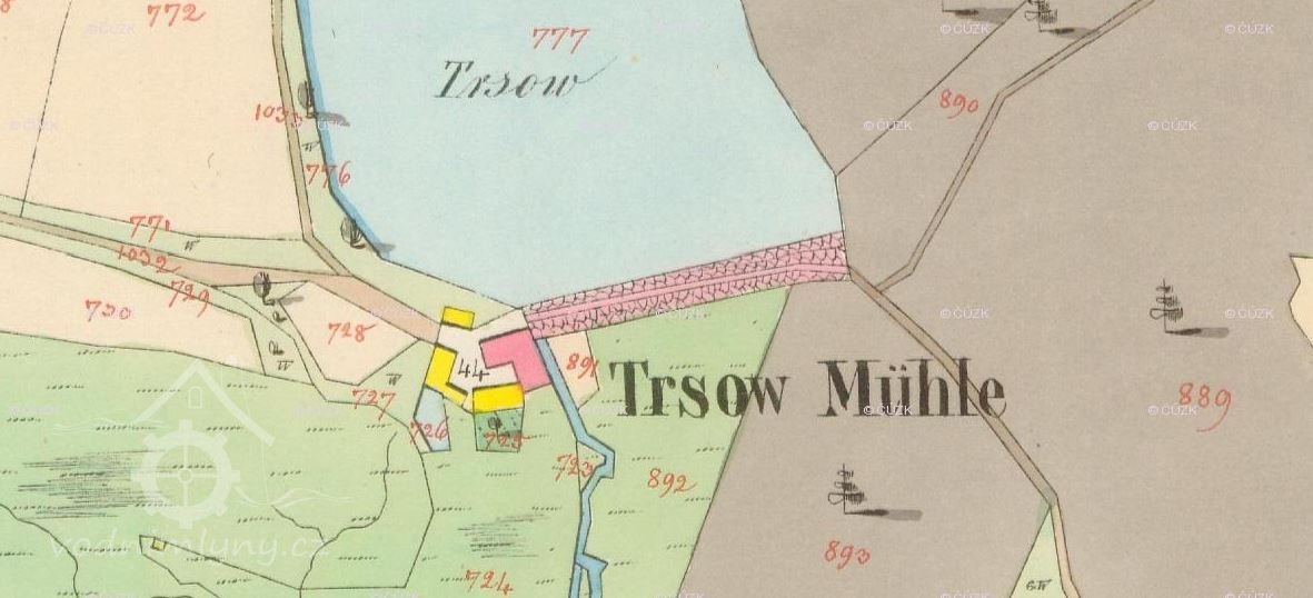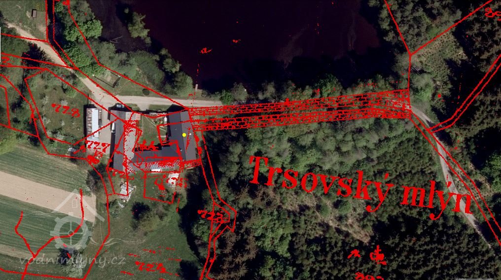 Voda se používá k pohonu mlýna a vede se Trsovského rybníka betonovým poutrubím o průměru 42 cm do dřevěných vantrok. V čele žlabu je závodní stavítko. Vodní kolo má průměr 3,4 m, šířku 1 m, 5,5 otáčky/min, průtok 110 l/s, spád 4,5 m a max.výkon 3,6 HP. Kolo táhne pouze jediný hlavní mlýnský stroj. Mlýnské stroje – 1 válcová stolice o průměru 40 cm a délce 30 cm; 1 válcová stolice o průměru 40 cm a délce 40 cm; 1 loupačka č.1 od f. Kašpar Vel. Senice; 1 francouzský kámen o průměru 87 cm; dále jsou zde trier, dynamo, výtahy, vysévače a ostatní obvyklé mlýnské příslušenství.