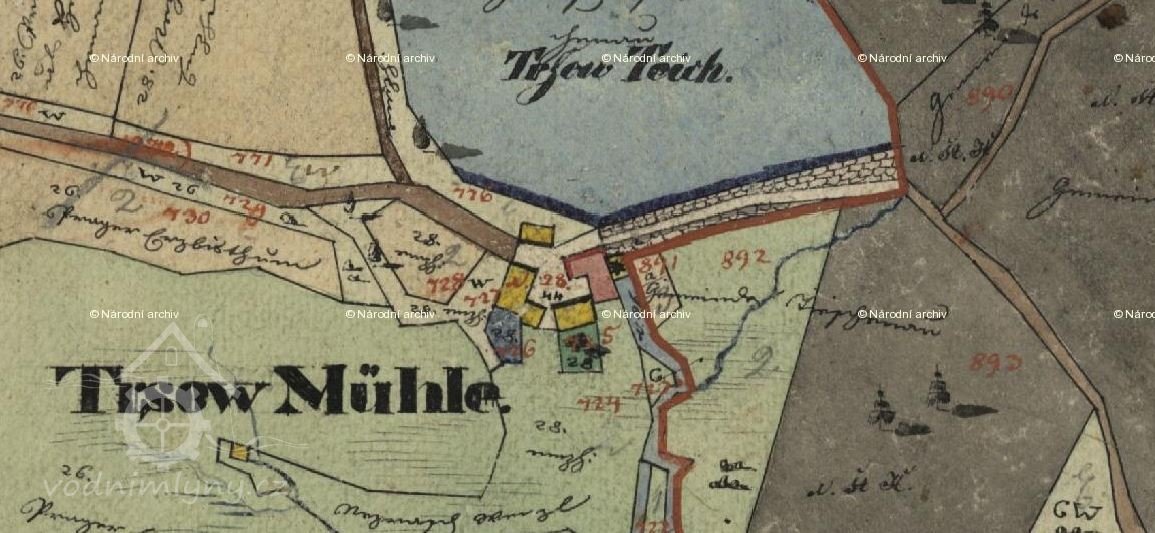 Voda potřebná ku hnaní strojů se táhne z mlýnské nádržky dřevěnou rourou 42 cm širokou a 40 cm vysokou, která ústí do vantrok a ze strany nádržky se hradí stavidlem. Nádržka zřízena z bývalého rybníka č.parc.777.