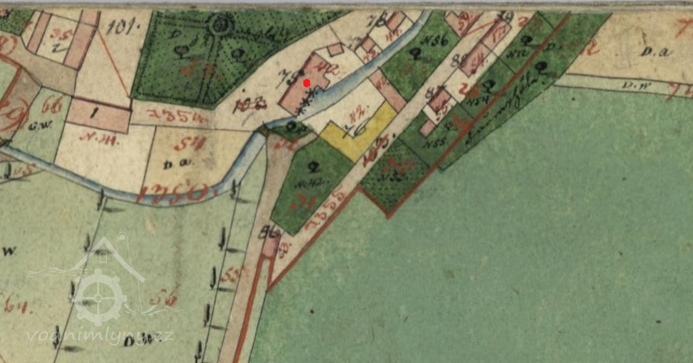 V krátkém úseku celý potok převeden do náhonu (není použit odběr části vody z potoka). Hned následuje jalový přepad od něhož už voda teče přirozeným korytem.