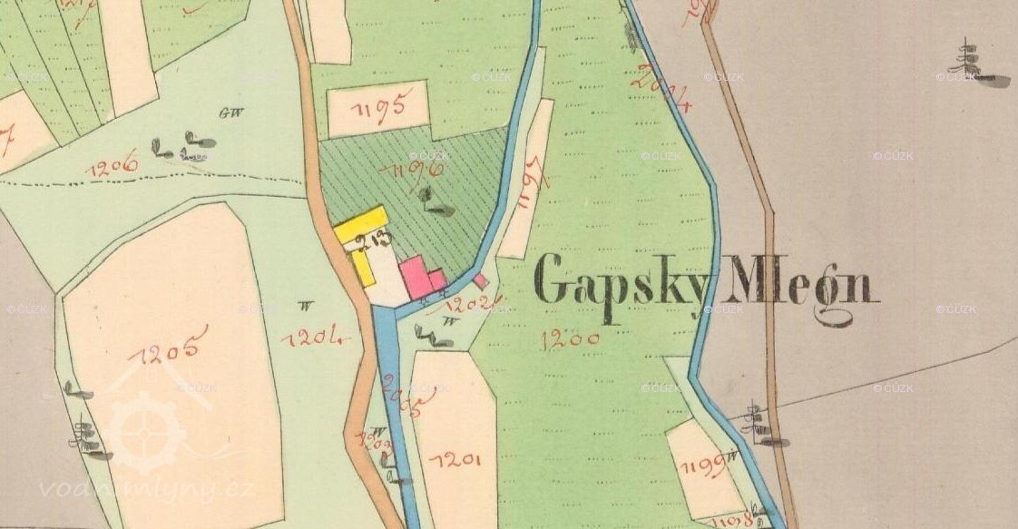 Voda z Čápského rybníka vedena náhonem od jižního konce hráze do nadýmáčku nad mlýnem, odtud na vantroky