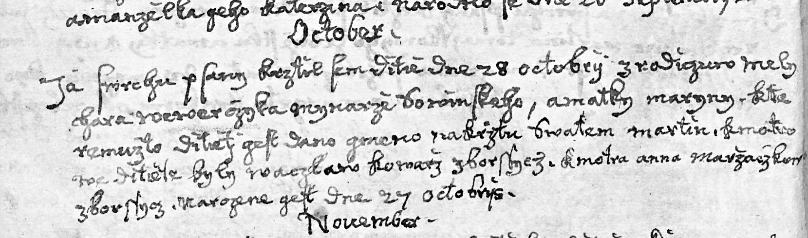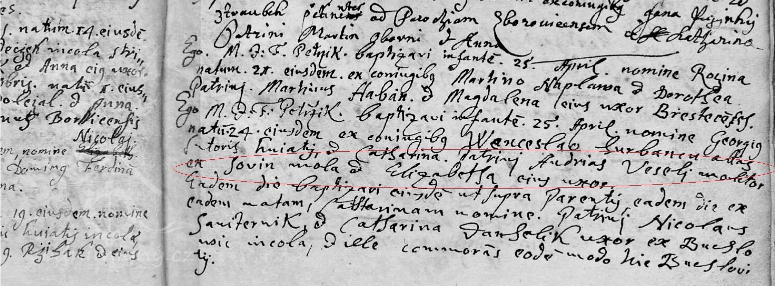 25. dubna 1665 šli za kmotry Ondřej Veselý, mlynář ze Sovína, a jeho manželka Alžběta za kmotry Jiřímu, synovi Václava Hurbancu a jeho ženy Kateřiny.