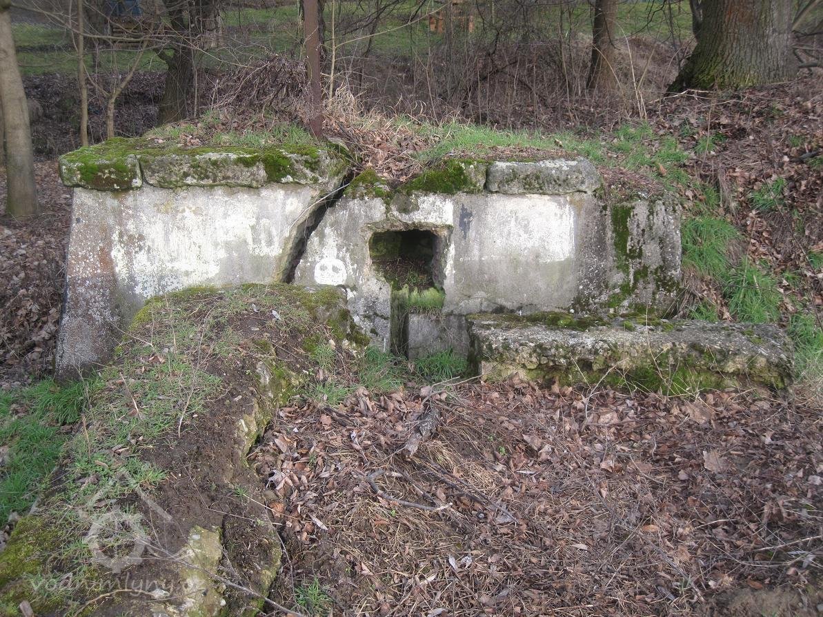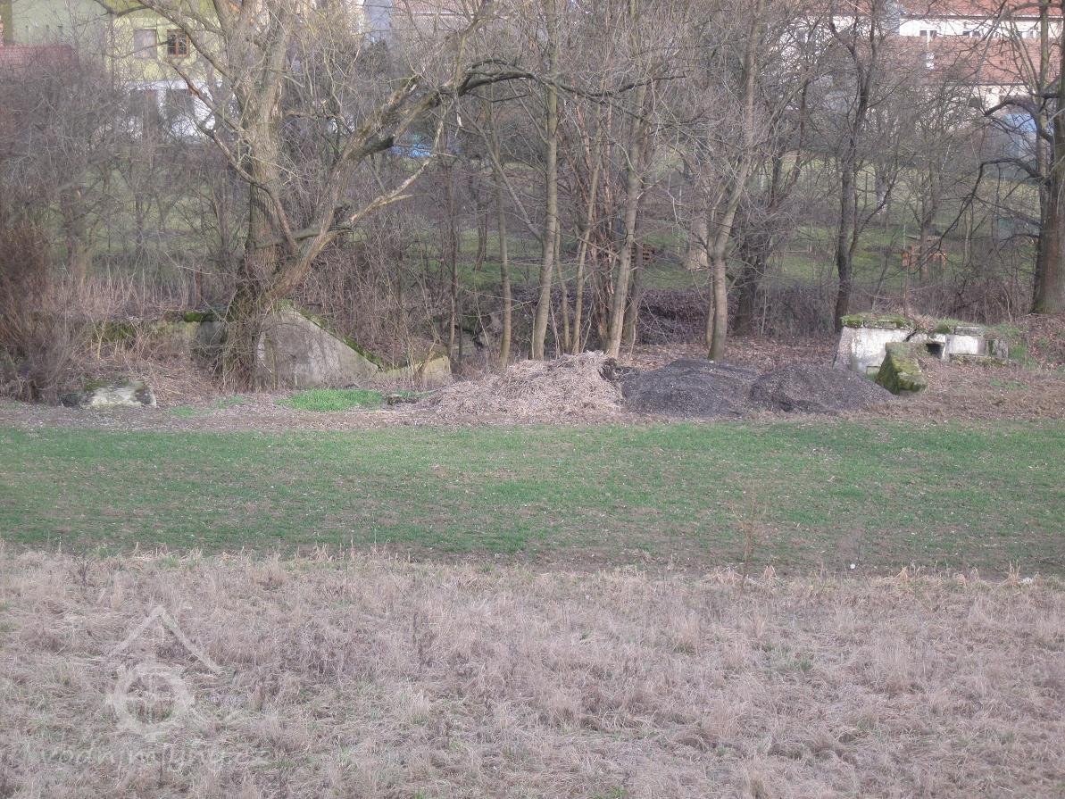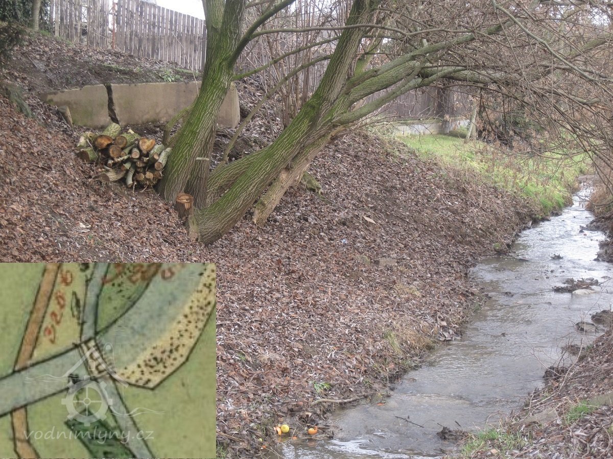Jez kombinován s jalovým přepadem. Voda v náhonu musí překročit potůček (akvadukt).