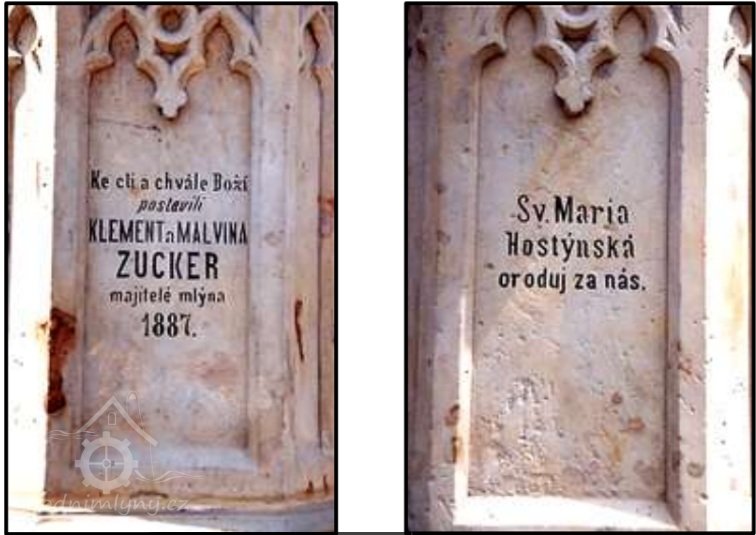 1887 Klement a Malvína Zuckerovi nechali u mlýna postavit sochu P. Marie Hostýnské jako poděkování za uzdravení svého nemocného syna.
